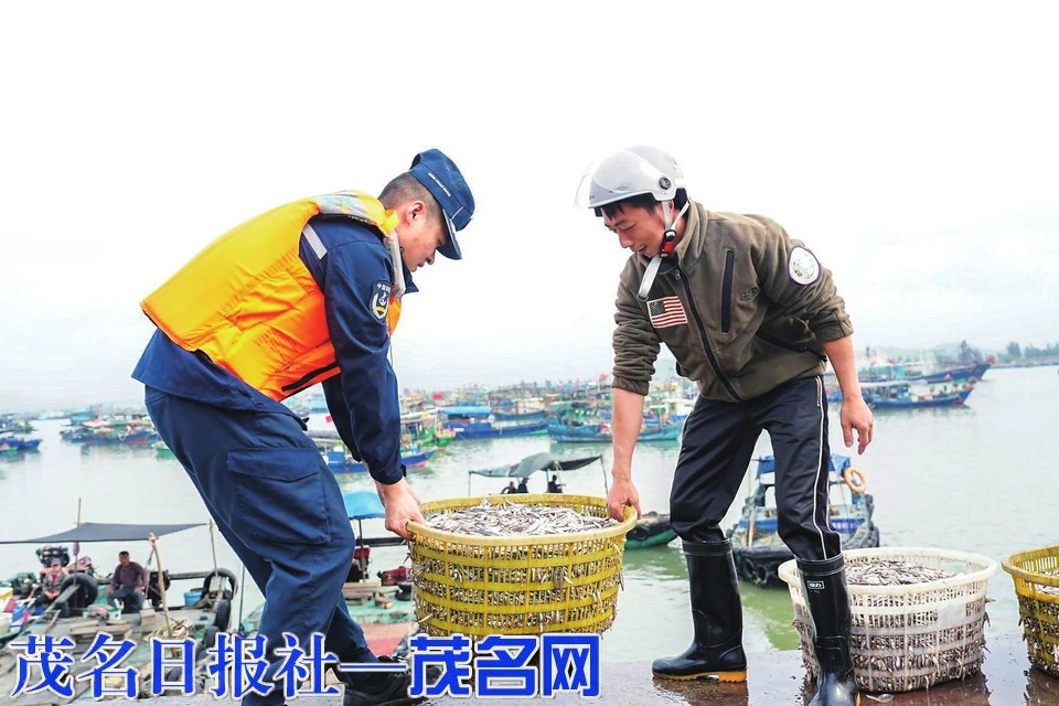 执法员帮渔民搬运渔获物。通讯员 陈新元 谭苡铭 摄