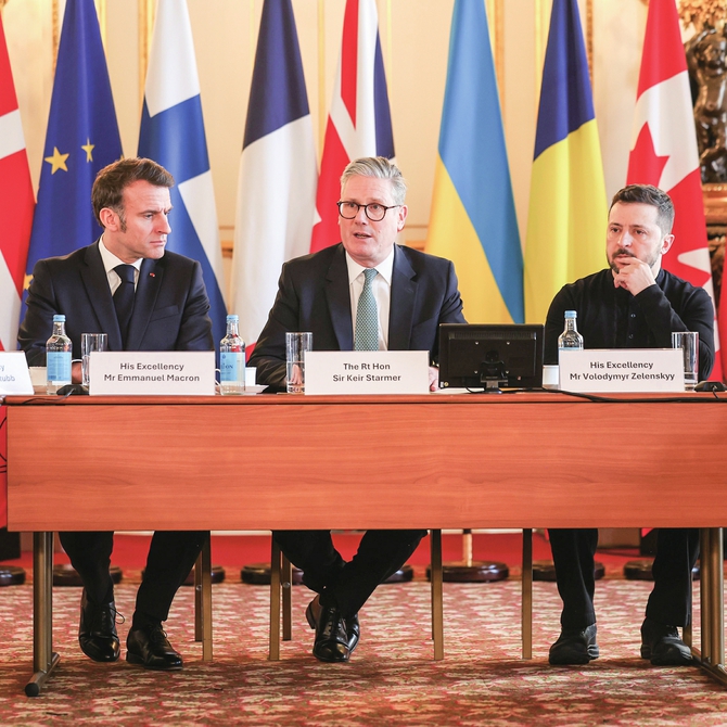 3月2日,在英国首都伦敦,英国首相斯塔默(右二)、法国总统马克龙(左一)和乌克兰总统泽连斯基(右一)出席峰会。新华社发(英国首相府供图)