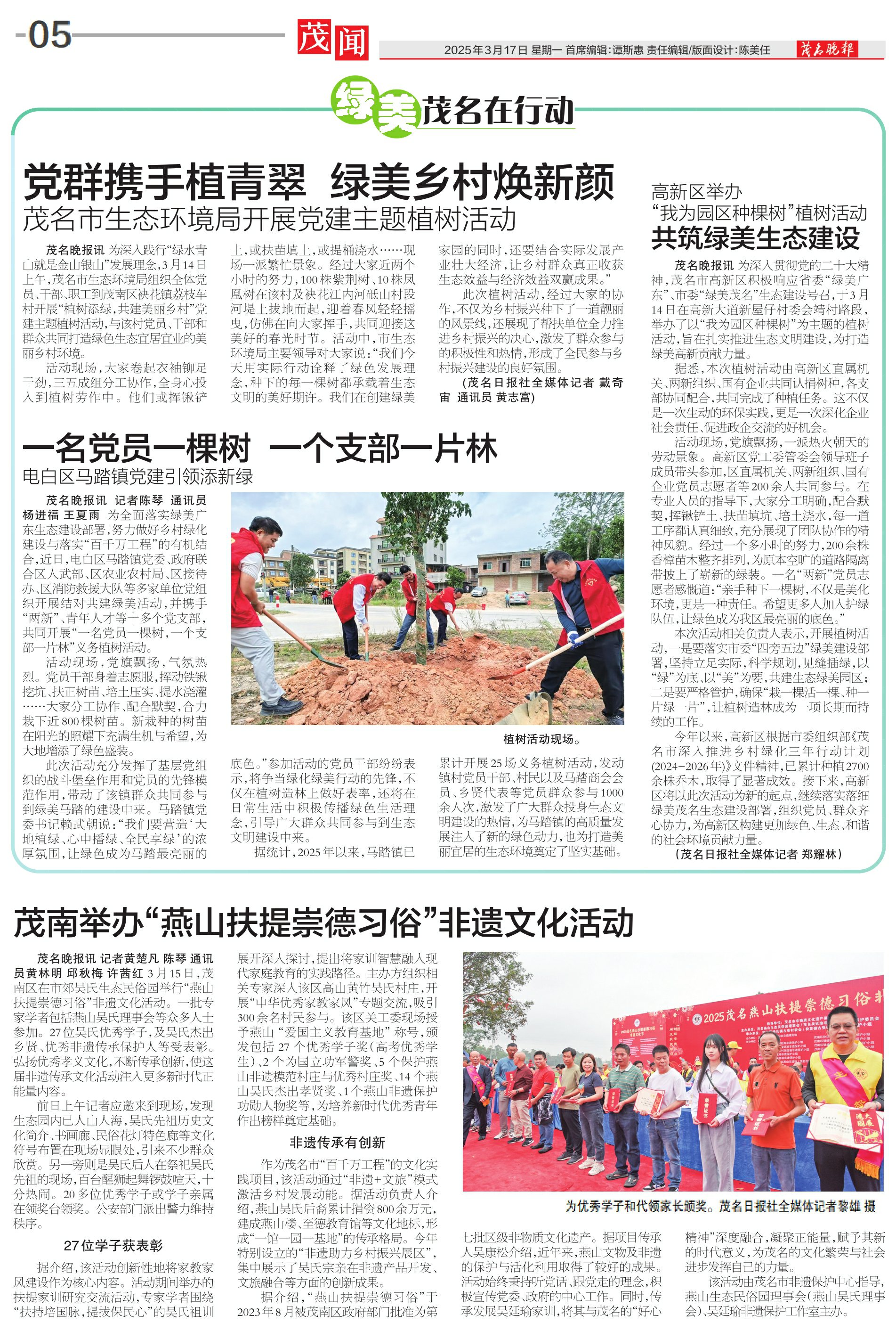 茂名晚报讯 记者 黄楚凡 陈琴 通讯员 黄林明 邱秋梅 许茜红 3月15日,茂南区在市郊吴氏生态民俗园举行“燕山扶提崇德习俗”非遗文化活动。一批专家学者包括燕山吴氏理事会等众多人士参加。27位吴氏优秀学子,及吴氏杰出乡贤、优秀非遗传承保护人等受表彰。弘扬优秀孝义文化,不断传承创新,使这届非遗传承文化活动注入更多新时代正能量内容。
