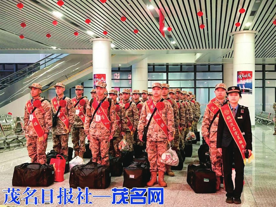 茂名晚报讯 记者黄楚凡 通讯员牛赞凯 姚琪 3月24日,记者走进广东茂名火车站看到一道靓丽风景线,候车室里,一排排新兵们身着迷彩,戴大红花、手提行囊,整齐列队等候出发,他们带着自己的理想与家人的嘱托,即将奔赴祖国各地的军营,踏上保家卫国的新征程。