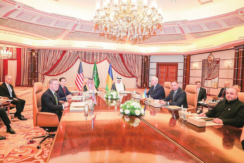 这是3月11日在沙特阿拉伯吉达拍摄的美国和乌克兰代表团会谈现场。新华社记者 王东震 摄