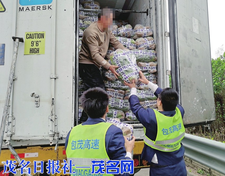 包茂高速电白站工作人员许磊、黄其等通过接力,帮助司机将掉落的青菜搬回车厢。