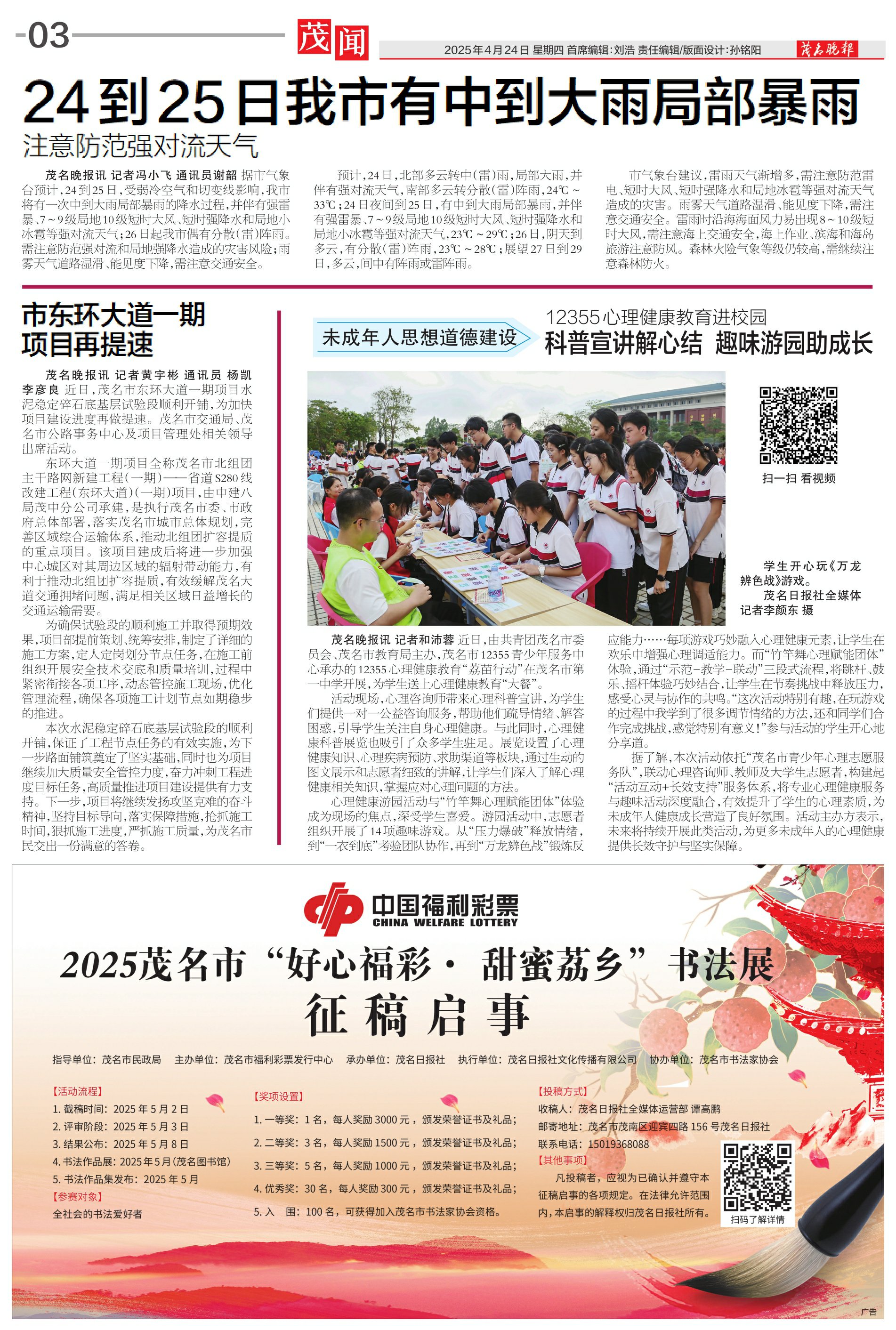 茂名晚报讯 记者 和沛蓉 近日,由共青团茂名市委员会、茂名市教育局主办,茂名市12355青少年服务中心承办的12355心理健康教育“荔苗行动”在茂名市第一中学开展,为学生送上心理健康教育“大餐”。
