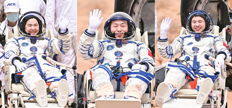 4月30日,神舟十九号航天员王浩泽、蔡旭哲、宋令东(从左至右)安全顺利出舱(拼版照片)。