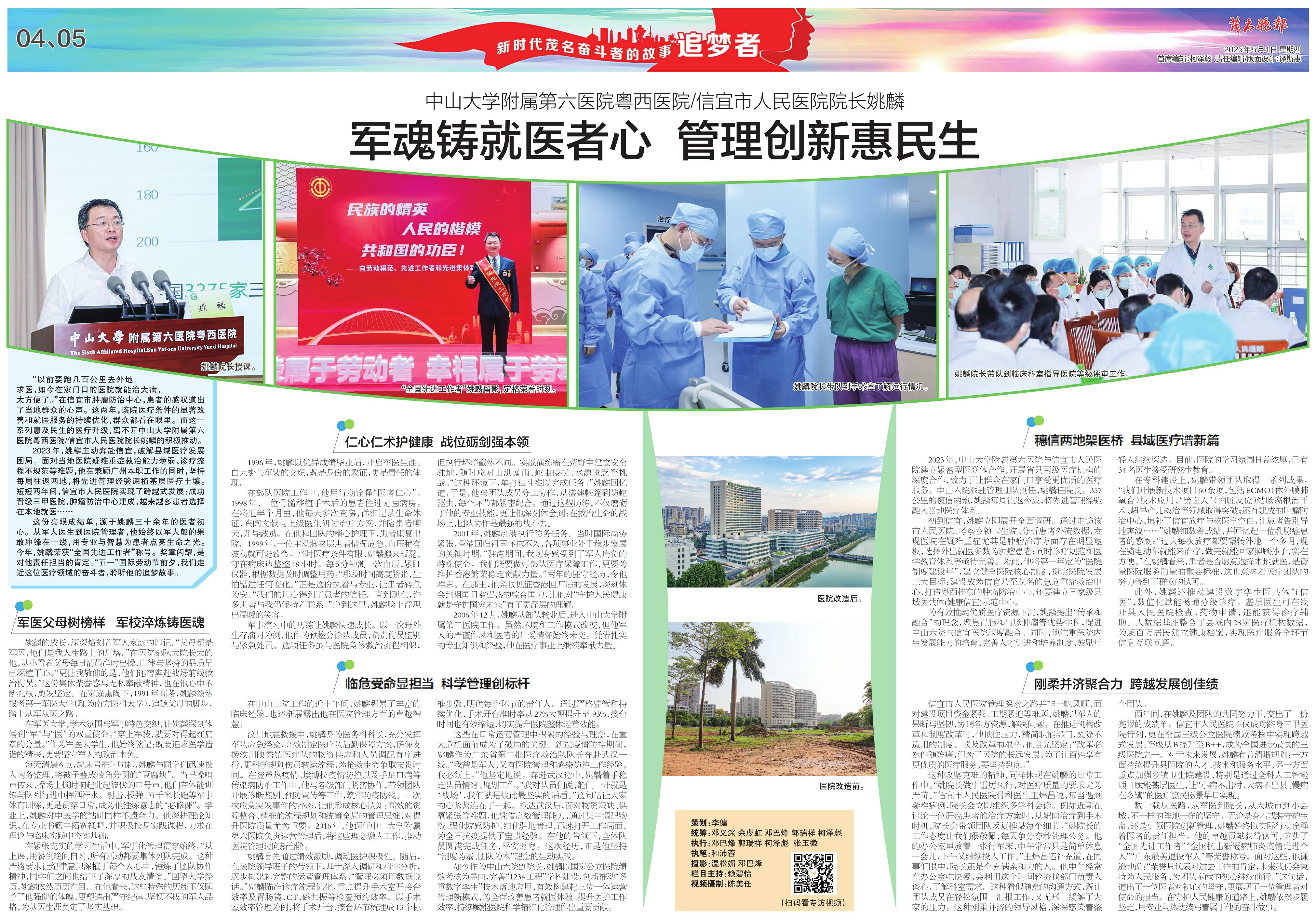数十载从医路,从军医到院长,从大城市到小县城,不一样的阵地一样的坚守。无论是身着戎装守护生命,还是引领医院创新管理,姚麟始终以实际行动诠释着医者的责任担当。他的卓越贡献获得认可,荣获了“全国先进工作者”“全国抗击新冠病肺炎疫情先进个人”“广东最美退役军人”等荣誉称号。面对这些,他谦逊地说:“荣誉只代表对过去工作的肯定,未来我仍会秉持为人民服务、为团队奉献的初心继续前行。”这句话,道出了一位医者对初心的坚守,更展现了一位管理者对使命的担当。在守护人民健康的道路上,姚麟依然步履坚定,用专业与热忱续写着属于他的奋斗故事。