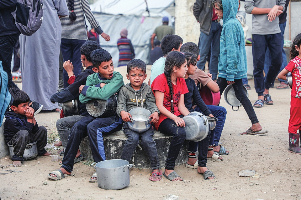 5月2日,孩子们在加沙城等待领取救助食物。新华社发(里泽克·阿卜杜勒贾瓦德 摄)