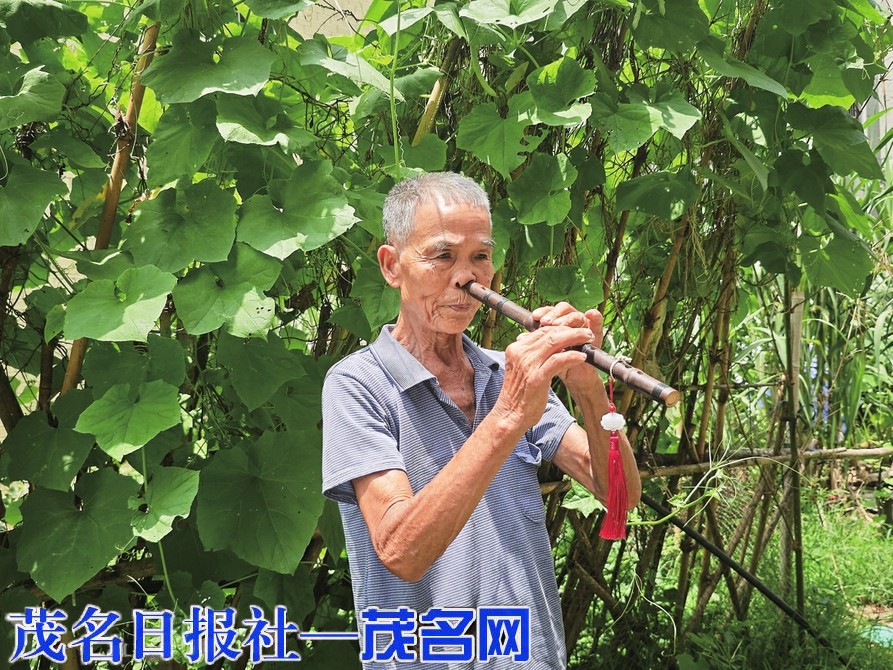 茂名晚报讯 记者 李光耀 通讯员 周华太 在化州市合江镇塘坑村岭下村,夏夜虫鸣常被另一种奇特的悠扬笛声打破。79岁的黎玉振老人坐在自家门前,将竹笛轻抵鼻孔,气息流转,一串串充满时代印记的音符便从鼻腔中流淌而出,飘荡在村舍的寂静里,也飘向远方无数陌生人的屏幕中。