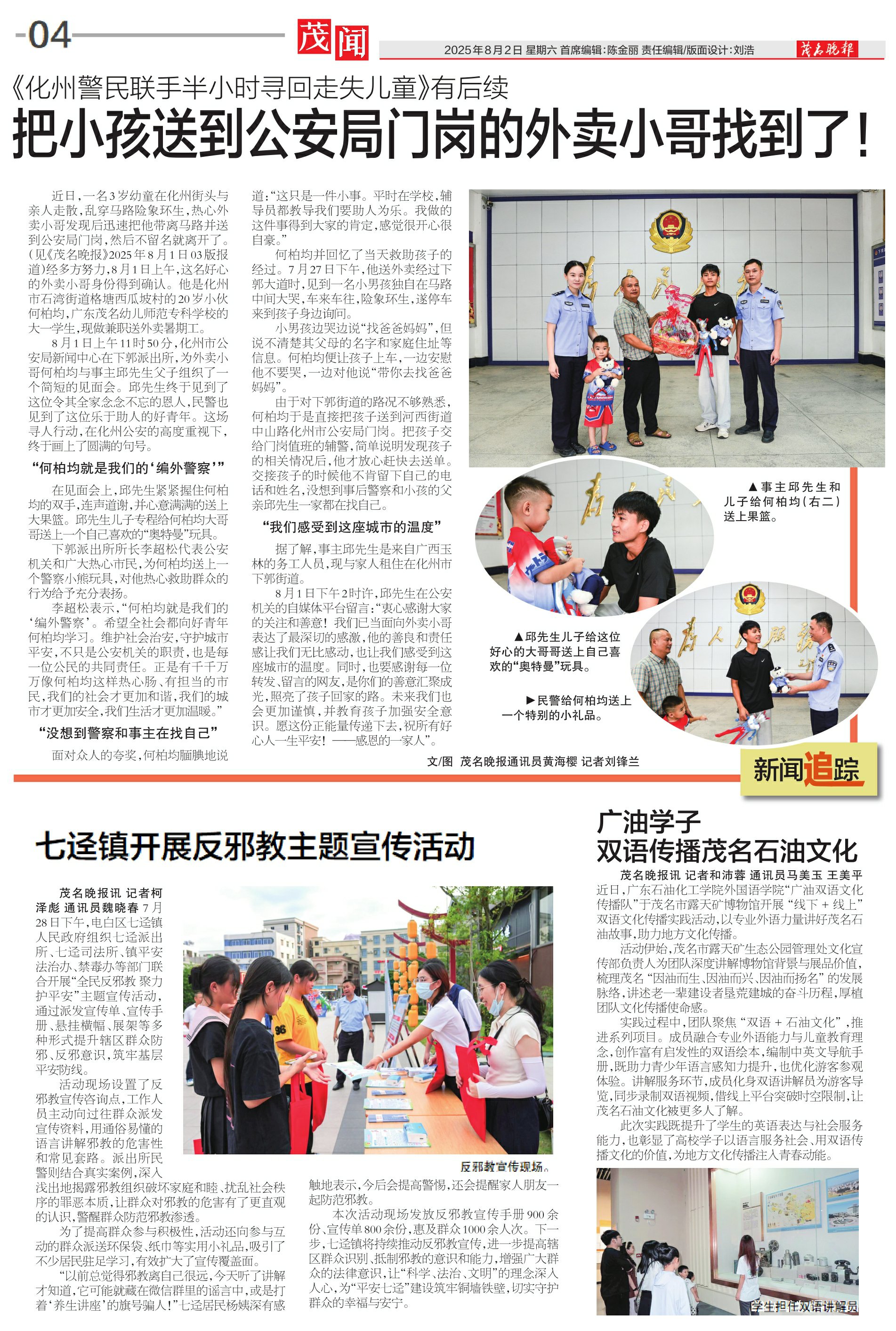 茂名晚报讯 记者柯泽彪 通讯员魏晓春 7月28日下午,电白区七迳镇人民政府组织七迳派出所、七迳司法所、镇平安法治办、禁毒办等部门联合开展“全民反邪教聚力护平安”主题宣传活动,通过派发宣传单、宣传手册、悬挂横幅、展架等多种形式提升辖区群众防邪、反邪意识,筑牢基层平安防线。