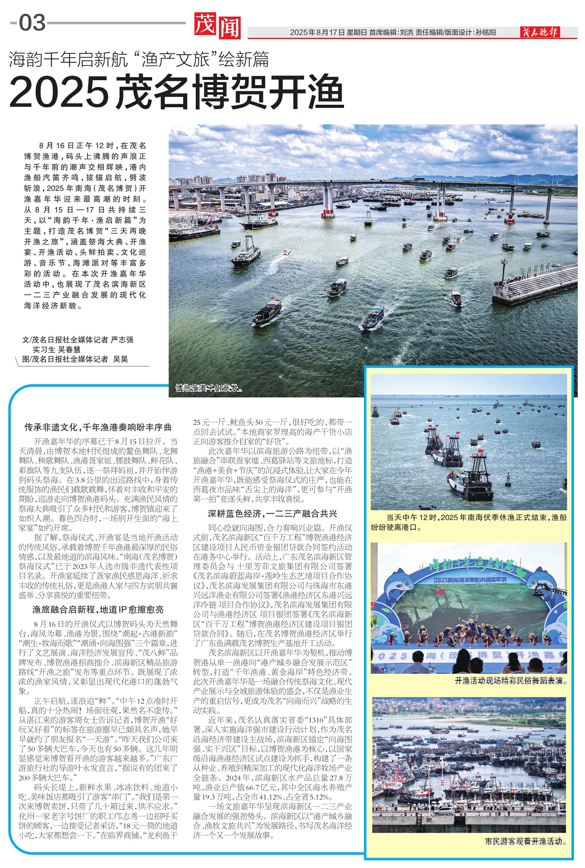 8月16日正午12时,在茂名博贺渔港,码头上沸腾的声浪正与千年前的潮声交相辉映,港内渔船汽笛齐鸣,拔锚启航,劈波斩浪,2025年南海(茂名博贺)开渔嘉年华迎来最高潮的时刻。从 8 月 15 日—17 日共持续三天,以“海韵千年·渔启新篇”为主题,打造茂名博贺“三天两晚开渔之旅”,涵盖祭海大典、开渔宴、开渔活动、头鲜拍卖、文化巡游、音乐节、海滩派对等丰富多彩的活动。在本次开渔嘉年华活动中,也展现了茂名滨海新区一二三产业融合发展的现代化海洋经济新貌。