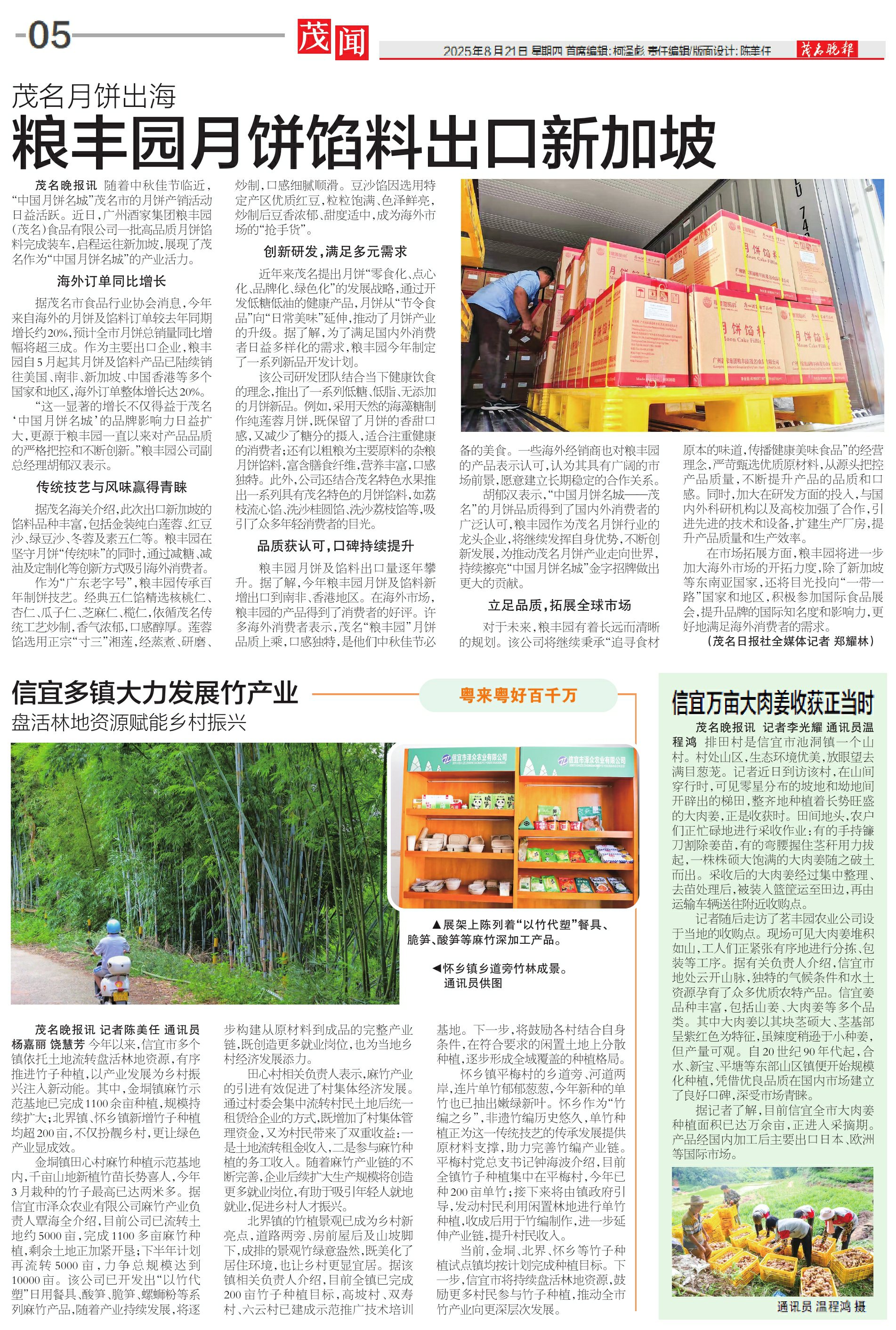茂名晚报讯 随着中秋佳节临近,“中国月饼名城”茂名市的月饼产销活动日益活跃。近日,广州酒家集团粮丰园(茂名)食品有限公司一批高品质月饼馅料完成装车,启程运往新加坡,展现了茂名作为“中国月饼名城”的产业活力。
