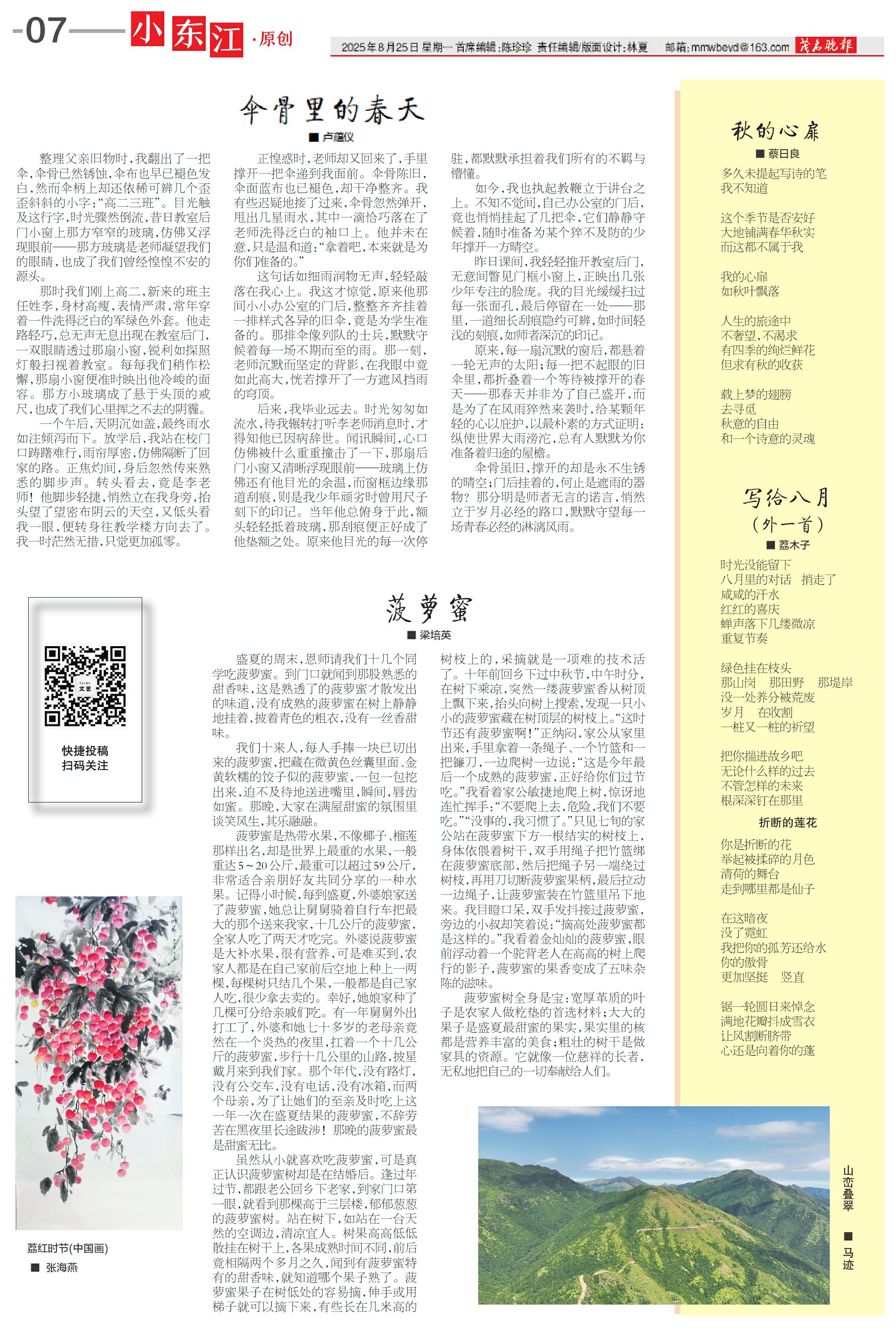 虽然从小就喜欢吃菠萝蜜,可是真正认识菠萝蜜树却是在结婚后。逢过年过节,都跟老公回乡下老家,到家门口第一眼,就看到那棵高于三层楼,郁郁葱葱的菠萝蜜树。站在树下,如站在一台天然的空调边,清凉宜人。树果高高低低散挂在树干上,各果成熟时间不同,前后竟相隔两个多月之久,闻到有菠萝蜜特有的甜香味,就知道哪个果子熟了。菠萝蜜果子在树低处的容易摘,伸手或用梯子就可以摘下来,有些长在几米高的树枝上的,采摘就是一项难的技术活了。十年前回乡下过中秋节,中午时分,在树下乘凉,突然一缕菠萝蜜香从树顶上飘下来,抬头向树上搜索,发现一只小小的菠萝蜜藏在树顶层的树枝上。“这时节还有菠萝蜜啊!”正纳闷,家公从家里出来,手里拿着一条绳子、一个竹篮和一把镰刀,一边爬树一边说:“这是今年最后一个成熟的菠萝蜜,正好给你们过节吃。”我看着家公敏捷地爬上树,惊讶地连忙挥手:“不要爬上去,危险,我们不要吃。”“没事的,我习惯了。”只见七旬的家公站在菠萝蜜下方一根结实的树枝上,身体依偎着树干,双手用绳子把竹篮绑在菠萝蜜底部,然后把绳子另一端绕过树枝,再用刀切断菠萝蜜果柄,最后拉动一边绳子,让菠萝蜜装在竹篮里吊下地来。我目瞪口呆,双手发抖接过菠萝蜜,旁边的小叔却笑着说:“摘高处菠萝蜜都是这样的。”我看着金灿灿的菠萝蜜,眼前浮动着一个驼背老人在高高的树上爬行的影子,菠萝蜜的果香变成了五味杂陈的滋味。