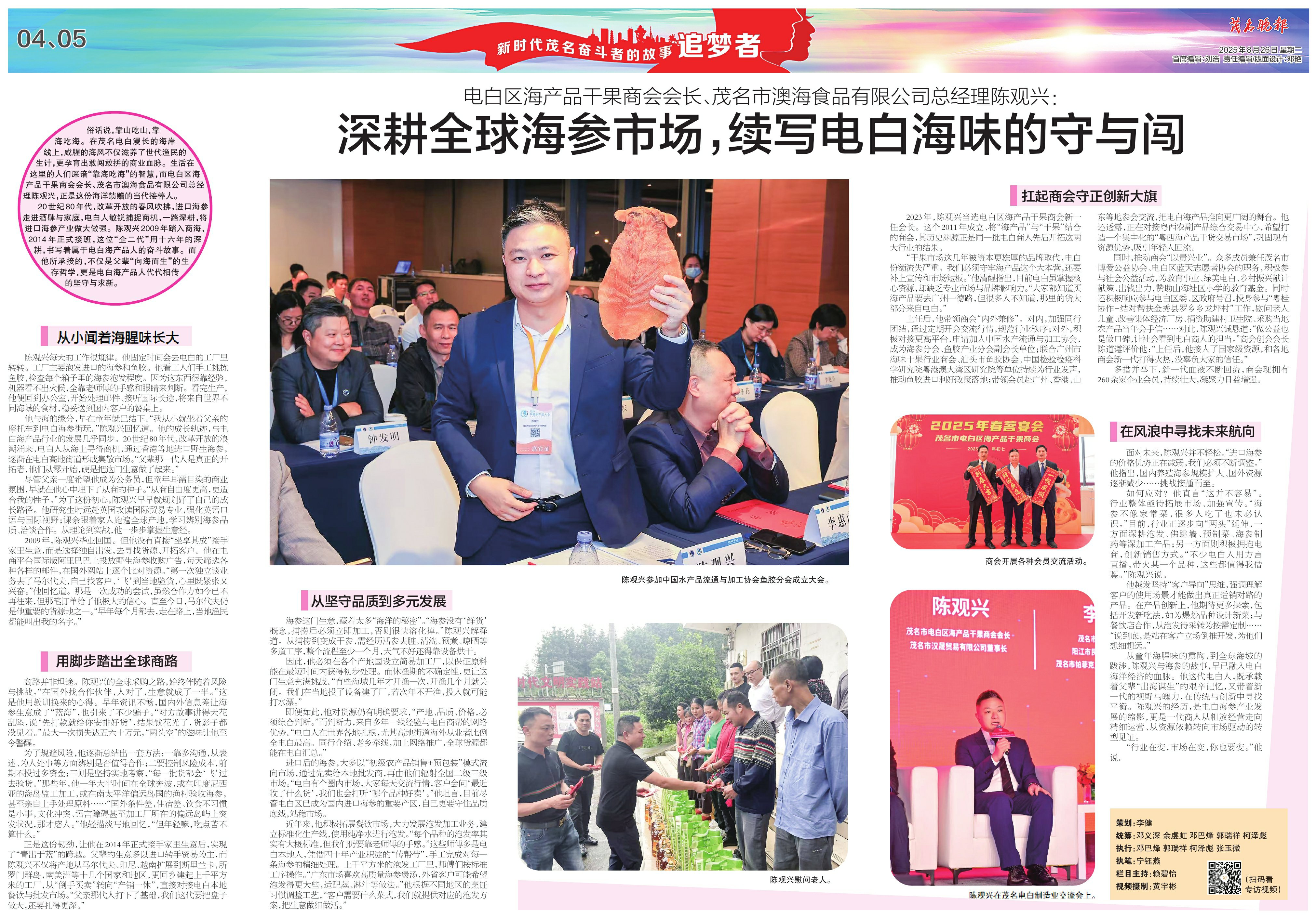 20世纪80年代,改革开放的春风吹拂,进口海参走进酒肆与家庭,电白人敏锐捕捉商机,一路深耕,将进口海参产业做大做强。陈观兴2009年踏入商海,2014年正式接班,这位“企二代”用十六年的深耕,书写着属于电白海产品人的奋斗故事。而他所承接的,不仅是父辈“向海而生”的生存哲学,更是电白海产品人代代相传的坚守与求新。