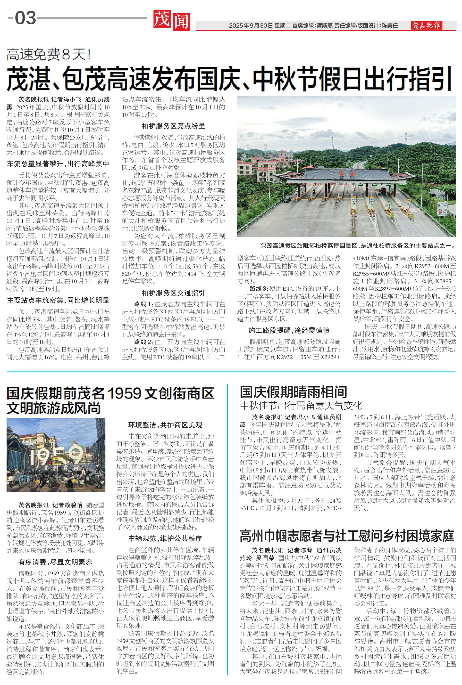 茂湛、包茂高速发布国庆、中秋节假日出行指引
