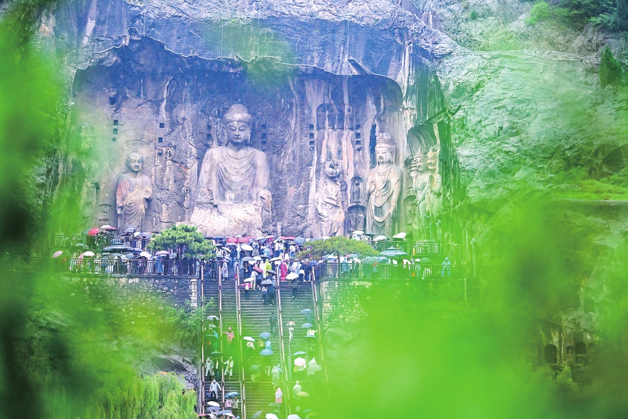 ▲10月1日,游客冒雨游览位于河南洛阳的龙门石窟。新华社发(李卫超 摄)