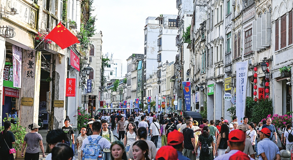 ▲10月1日,游客在海口骑楼老街游览。 新华社记者 杨冠宇 摄