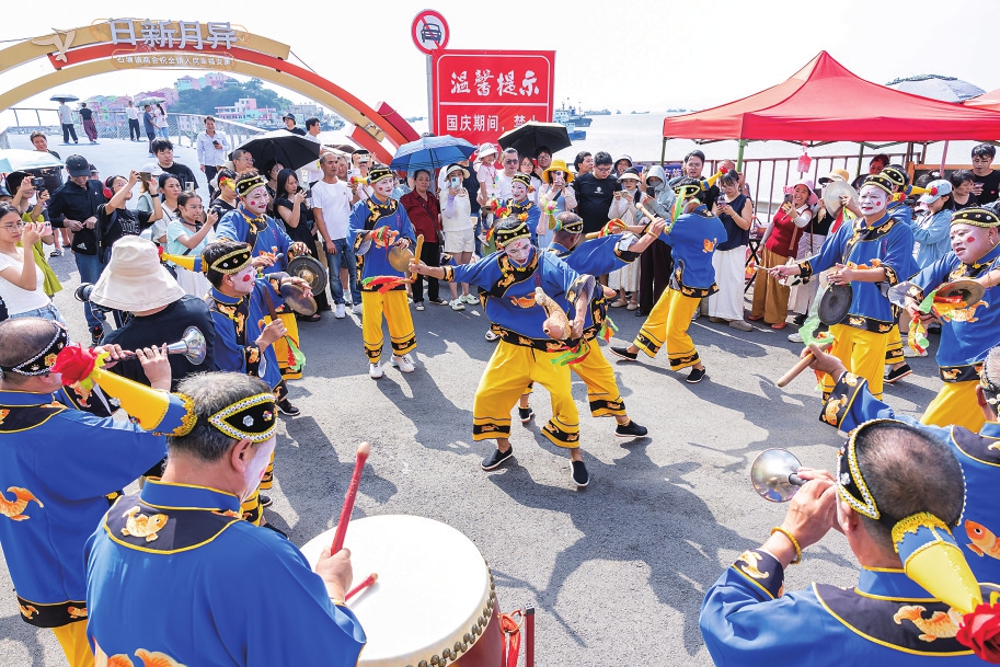 ▲10月1日,游客在浙江省温岭市石塘镇里箬村码头观看大奏鼓表演。新华社发(徐伟杰 摄)