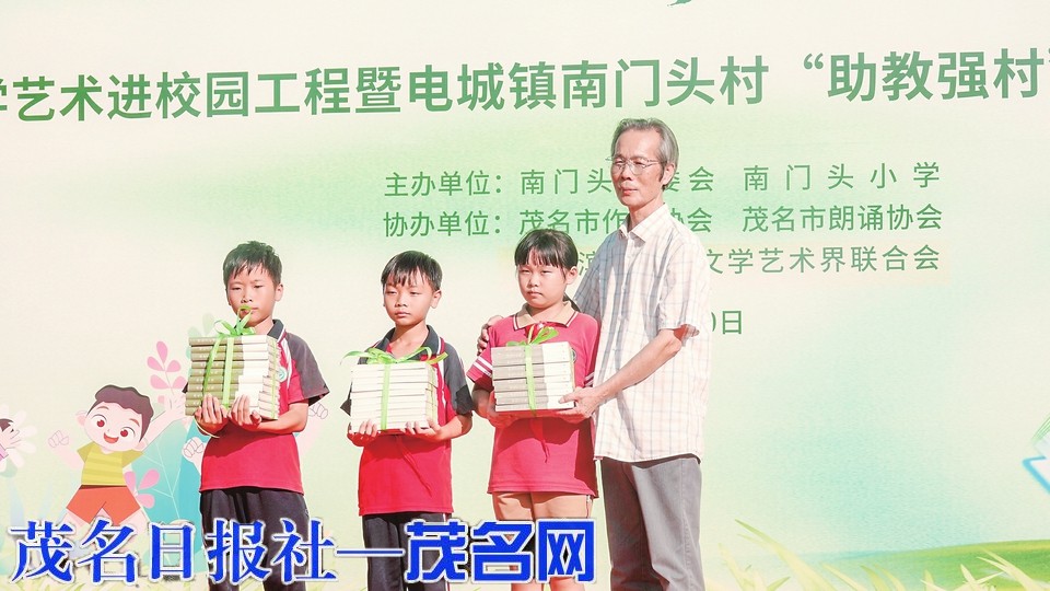 在“执笔承文脉,赠书启新智”赠送仪式上,校友张明祯向学生赠送毛笔,寄望少年以笔为舟,畅游文化长河。茂名市作家协会主席、南门头小学名誉校长张慧谋则带来《神电卫小城》书籍赠予学生,他深情说道:“乡村的孩子,更需要文学艺术的滋养。这些文字里有家乡的历史、有奋斗的精神,希望同学们能从书中看到更广阔的世界,也能以文墨为翼,筑就属于自己的梦想。‘助教强村’,强的不仅是教育,更是乡村的未来,是咱们下一代的精神底气。今天我们把文学艺术带到校园,就是要让星火成炬,照亮乡村教育的前路。”