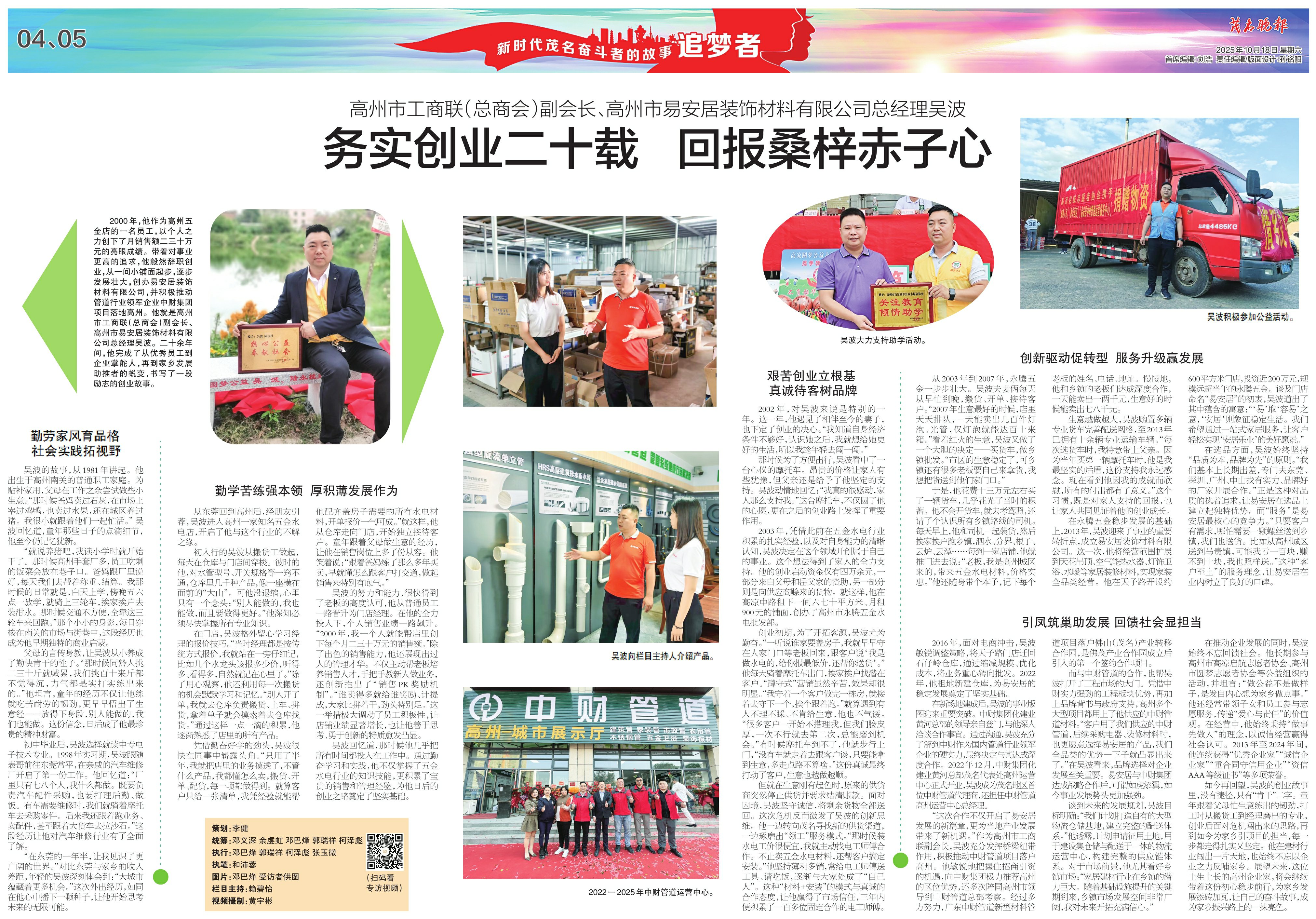 2000年,他作为高州五金店的一名员工,以个人之力创下了月销售额二三十万元的亮眼成绩。带着对事业更高的追求,他毅然辞职创业,从一间小铺面起步,逐步发展壮大,创办易安居装饰材料有限公司,并积极推动管道行业领军企业中财集团项目落地高州。他就是高州市工商联(总商会)副会长、高州市易安居装饰材料有限公司总经理吴波。二十余年间,他完成了从优秀员工到企业掌舵人,再到家乡发展助推者的蜕变,书写了一段励志的创业故事。