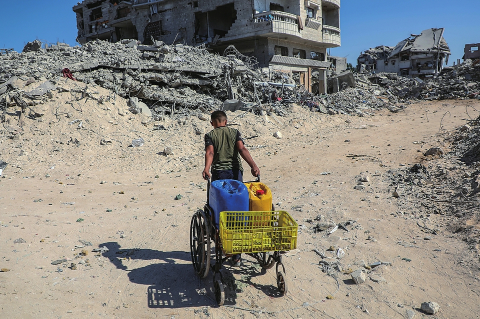 10月28日,在加沙地带的沙提难民营,巴勒斯坦少年拉车取水。新华社发(里泽克·阿卜杜勒贾瓦德 摄)