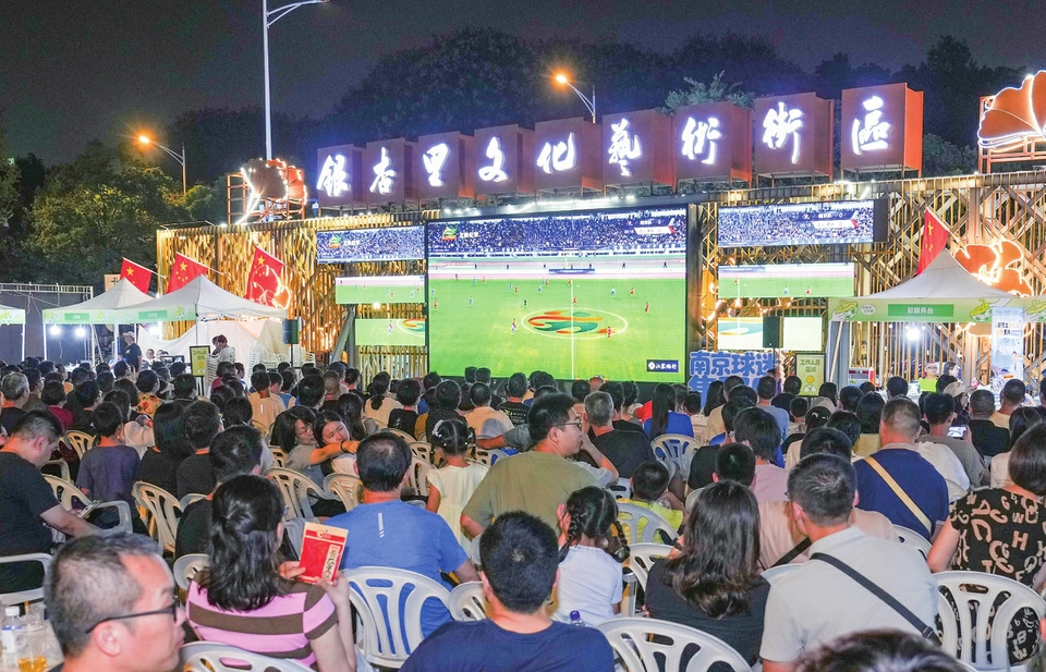 ▲10月4日,球迷在南京市建邺区银杏里文化艺术街区的“苏超”“第二现场”观赛。新华社记者 李博 摄