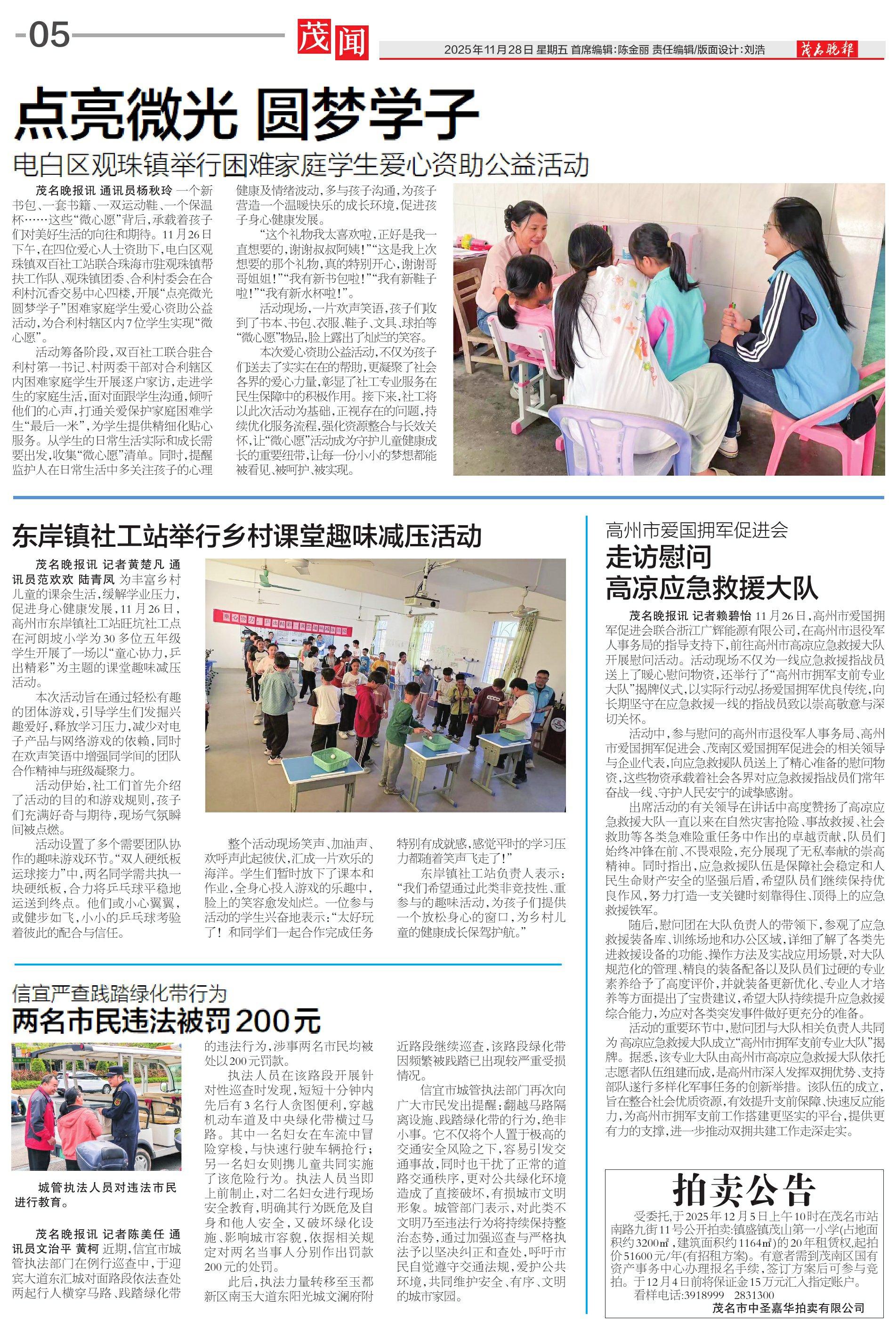 茂名晚报讯 通讯员杨秋玲 一个新书包、一套书籍、一双运动鞋、一个保温杯……这些“微心愿”背后,承载着孩子们对美好生活的向往和期待。11月26日下午,在四位爱心人士资助下,电白区观珠镇双百社工站联合珠海市驻观珠镇帮扶工作队、观珠镇团委、合利村委会在合利村沉香交易中心四楼,开展“点亮微光圆梦学子”困难家庭学生爱心资助公益活动,为合利村辖区内7位学生实现“微心愿”。