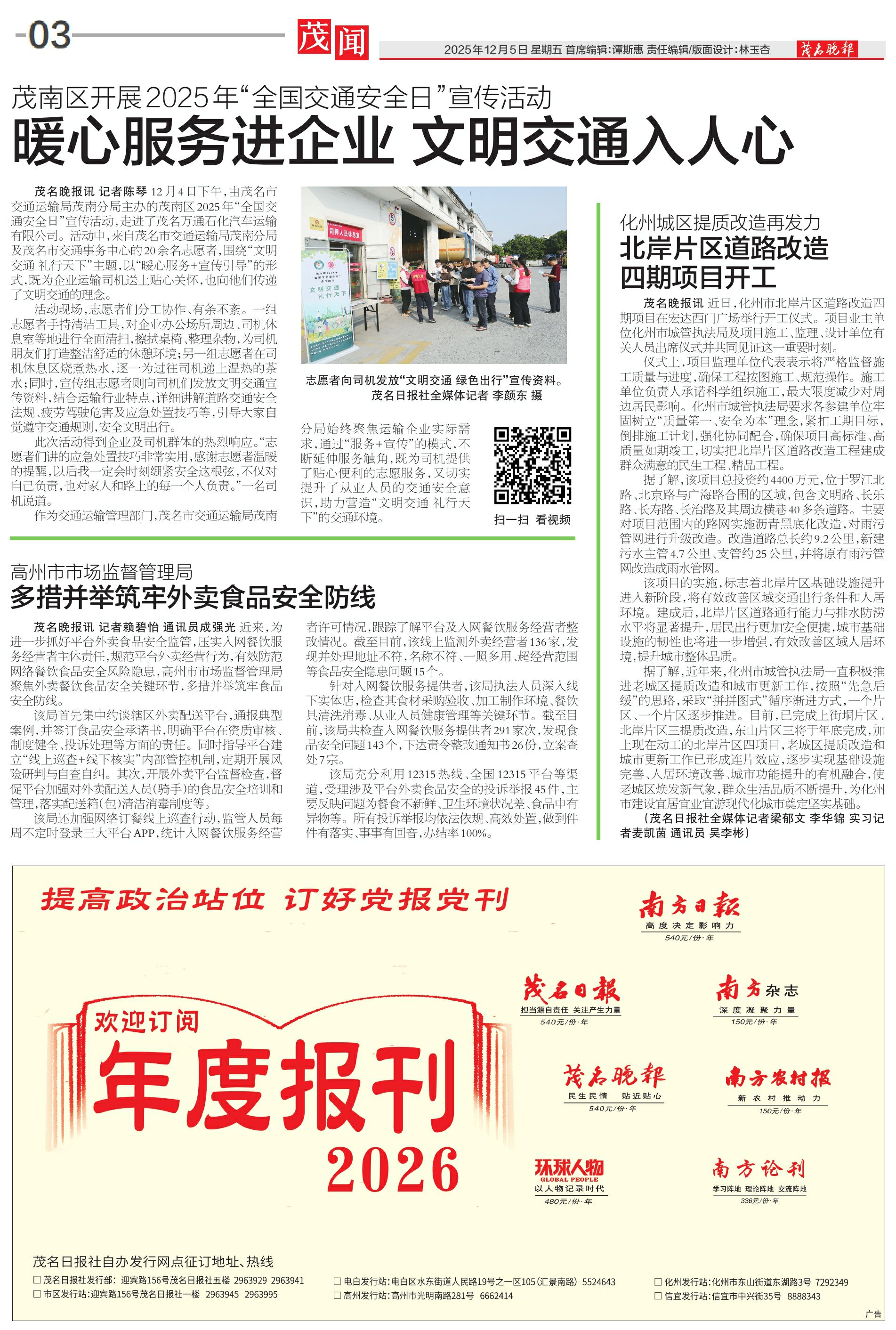 茂名晚报讯 记者 陈琴 12月4日下午,由茂名市交通运输局茂南分局主办的茂南区2025年“全国交通安全日”宣传活动,走进了茂名万通石化汽车运输有限公司。活动中,来自茂名市交通运输局茂南分局及茂名市交通事务中心的20余名志愿者,围绕“文明交通礼行天下”主题,以“暖心服务+宣传引导”的形式,既为企业运输司机送上贴心关怀,也向他们传递了文明交通的理念。