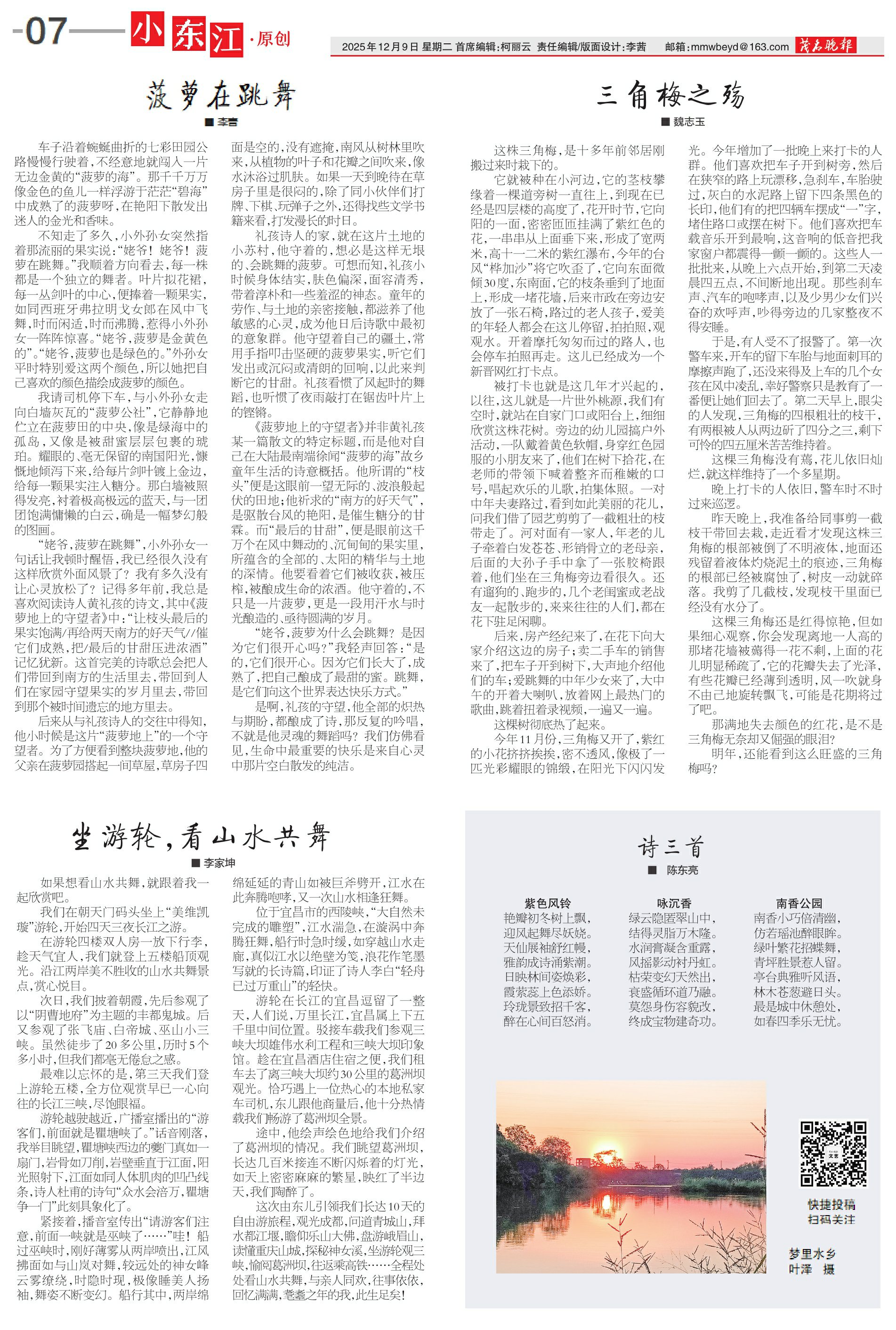 它就被种在小河边,它的茎枝攀缘着一棵道旁树一直往上,到现在已经是四层楼的高度了,花开时节,它向阳的一面,密密匝匝挂满了紫红色的花,一串串从上面垂下来,形成了宽两米,高十一二米的紫红瀑布,今年的台风“桦加沙”将它吹歪了,它向东面微倾30度,东南面,它的枝条垂到了地面上,形成一堵花墙,后来市政在旁边安放了一张石椅,路过的老人孩子,爱美的年轻人都会在这儿停留,拍拍照,观观水。开着摩托匆匆而过的路人,也会停车拍照再走。这儿已经成为一个新晋网红打卡点。