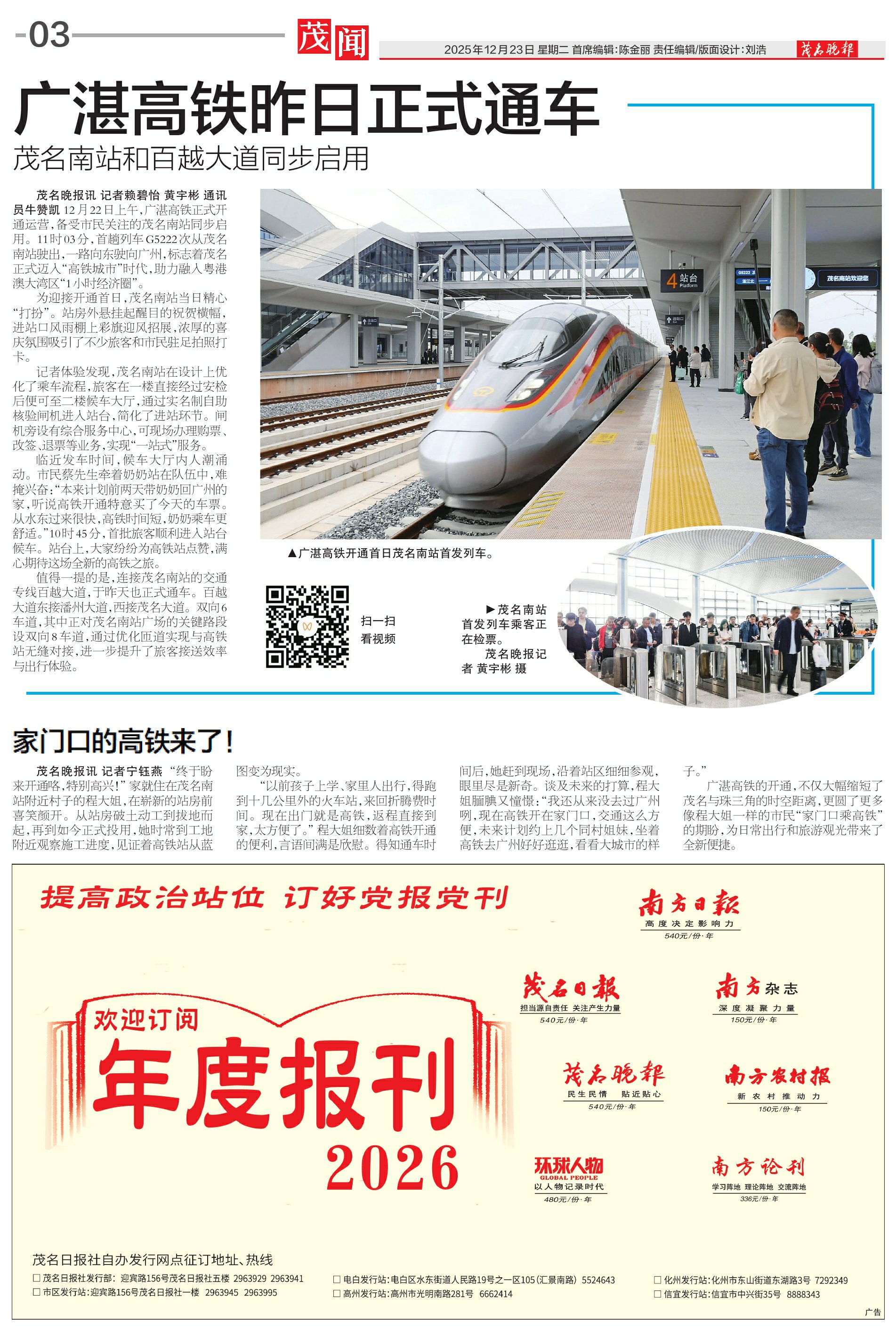 茂名晚报讯 记者 赖碧怡 黄宇彬 通讯员 牛赞凯 12月22日上午,广湛高铁正式开通运营,备受市民关注的茂名南站同步启用。11时03分,首趟列车G5222次从茂名南站驶出,一路向东驶向广州,标志着茂名正式迈入“高铁城市”时代,助力融入粤港澳大湾区“1小时经济圈”。