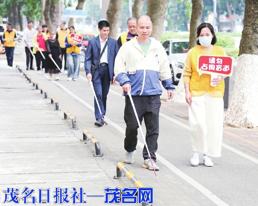 视障人士体验城市街道无障碍建设。茂名日报社全媒体记者 岑稳 摄