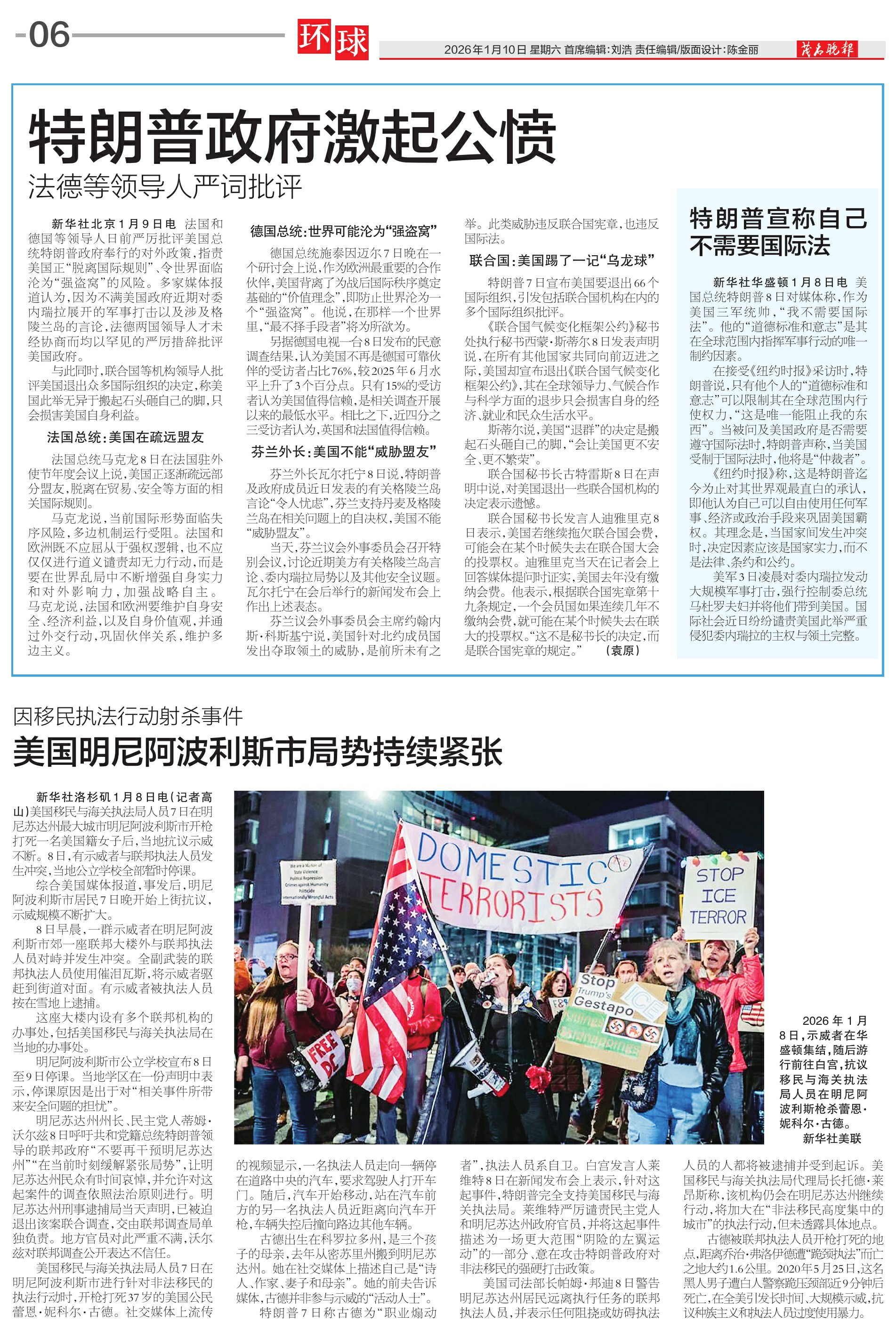 新华社洛杉矶1月8日电(记者高山)美国移民与海关执法局人员7日在明尼苏达州最大城市明尼阿波利斯市开枪打死一名美国籍女子后,当地抗议示威不断。8日,有示威者与联邦执法人员发生冲突,当地公立学校全部暂时停课。