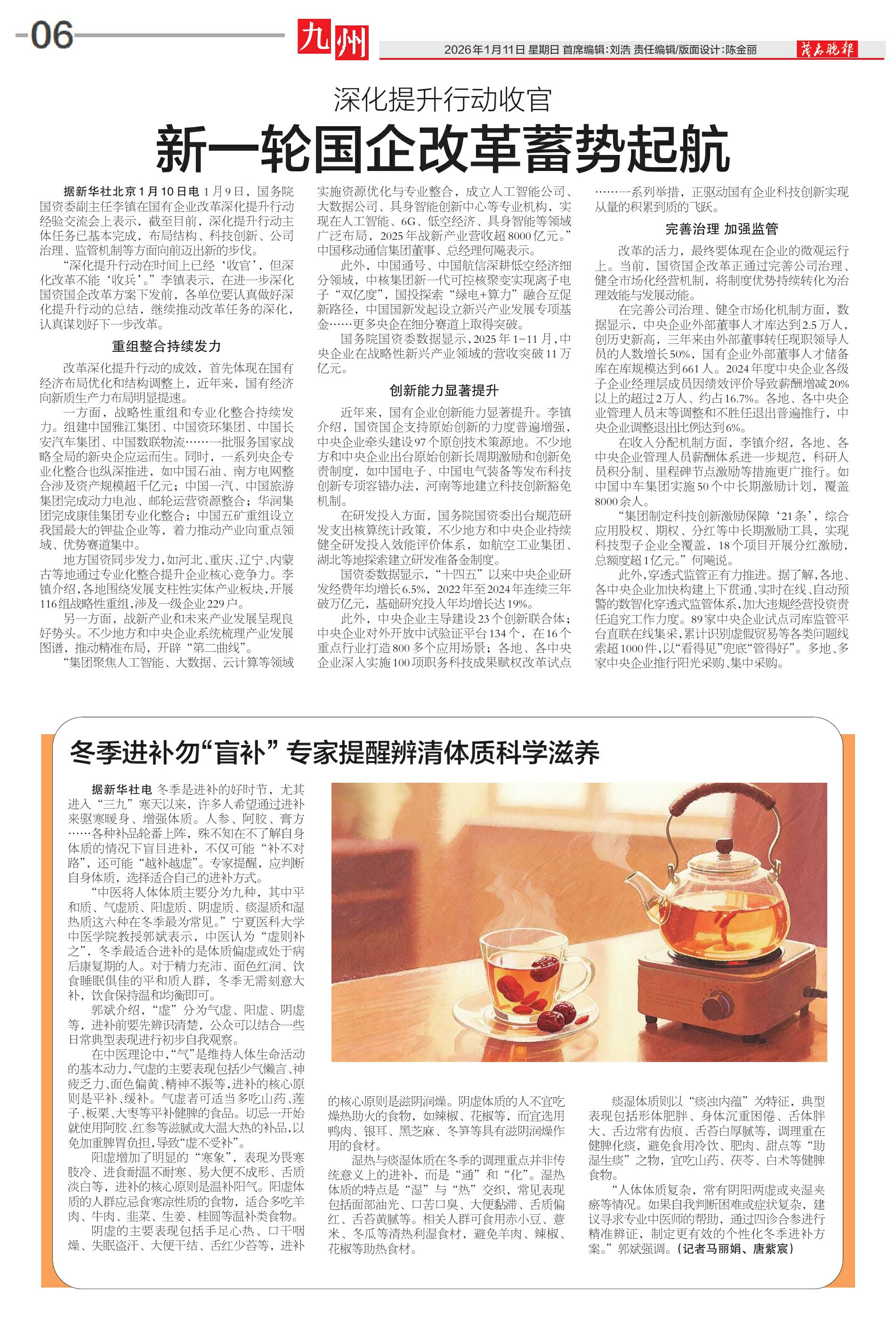 据新华社北京1月10日电 1月9日,国务院国资委副主任李镇在国有企业改革深化提升行动经验交流会上表示,截至目前,深化提升行动主体任务已基本完成,布局结构、科技创新、公司治理、监管机制等方面向前迈出新的步伐。