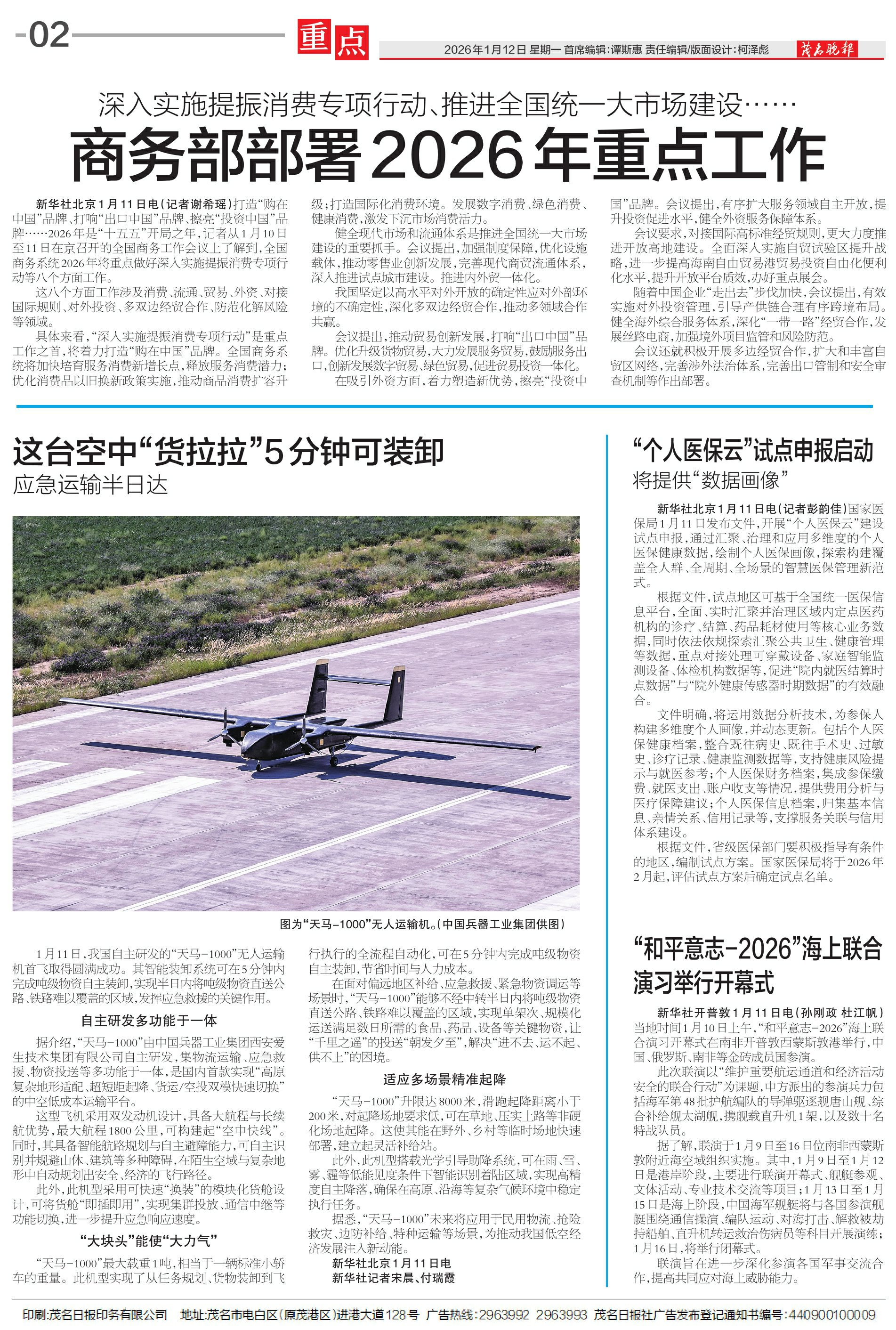 1月11日,我国自主研发的“天马-1000”无人运输机首飞取得圆满成功。其智能装卸系统可在5分钟内完成吨级物资自主装卸,实现半日内将吨级物资直送公路、铁路难以覆盖的区域,发挥应急救援的关键作用。