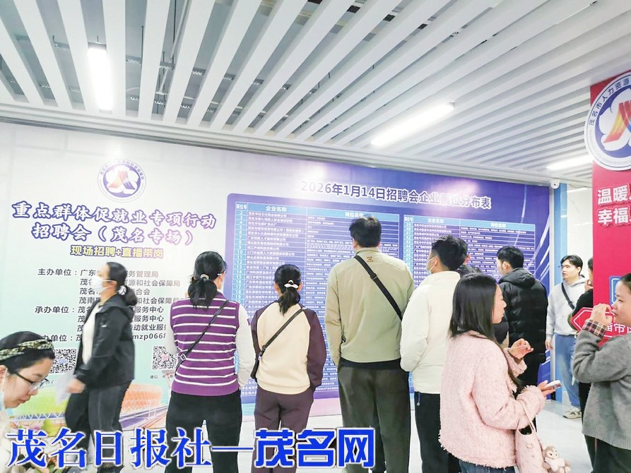 茂名晚报讯1月14日上午,由广东省就业服务管理局、茂名市人力资源和社会保障局、茂名市残疾人联合会及茂南区人力资源和社会保障局联合主办的重点群体促就业专项行动招聘会(茂名专场)在茂名市人力资源市场举行。本次招聘会精准聚焦在粤脱贫劳动力、长期登记失业人员、高校毕业生、农民工、就业困难人员等重点群体,吸引进场求职的人数超过1000人次。