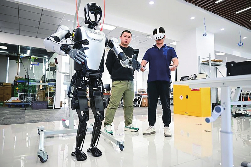 2025年10月24日,合肥乐聚机器人技术有限公司的机器人应用开发工程师张鸿伟(右)在同事的指导下使用VR设备进行机器人遥操作,用于动作捕获采集数据。 新华社记者 周牧 摄