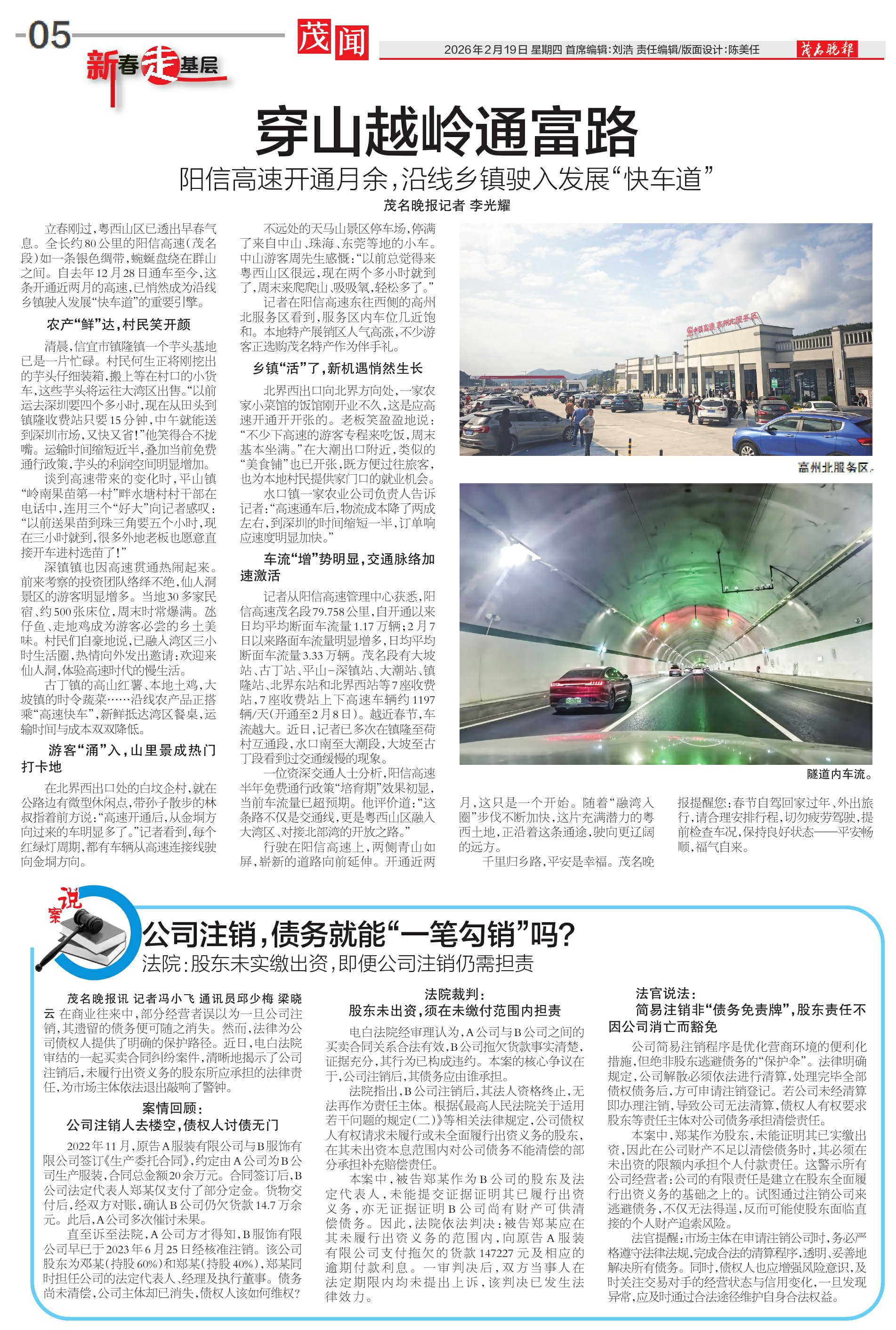 立春刚过,粤西山区已透出早春气息。全长约80公里的阳信高速(茂名段)如一条银色绸带,蜿蜒盘绕在群山之间。自去年12月28日通车至今,这条开通近两月的高速,已悄然成为沿线乡镇驶入发展“快车道”的重要引擎。