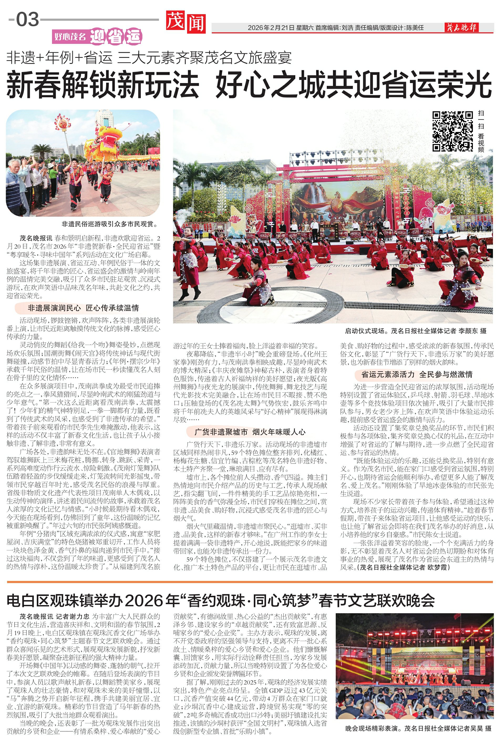 茂名晚报讯春和景明启新程,非遗欢歌迎省运。2月20日,茂名市2026年“非遗贺新春·全民迎省运”暨“粤享暖冬·寻味中国年”系列活动在文化广场启幕。