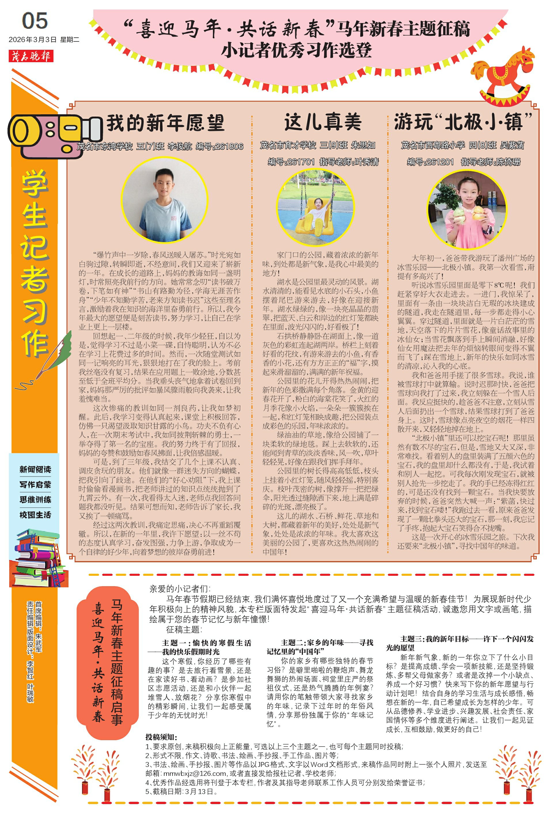 马年春节假期已经结束,我们满怀喜悦地度过了又一个充满希望与温暖的新春佳节!为展现新时代少年积极向上的精神风貌,本专栏版面特发起“喜迎马年·共话新春”主题征稿活动,诚邀您用文字或画笔,描绘属于您的春节记忆与新年憧憬!