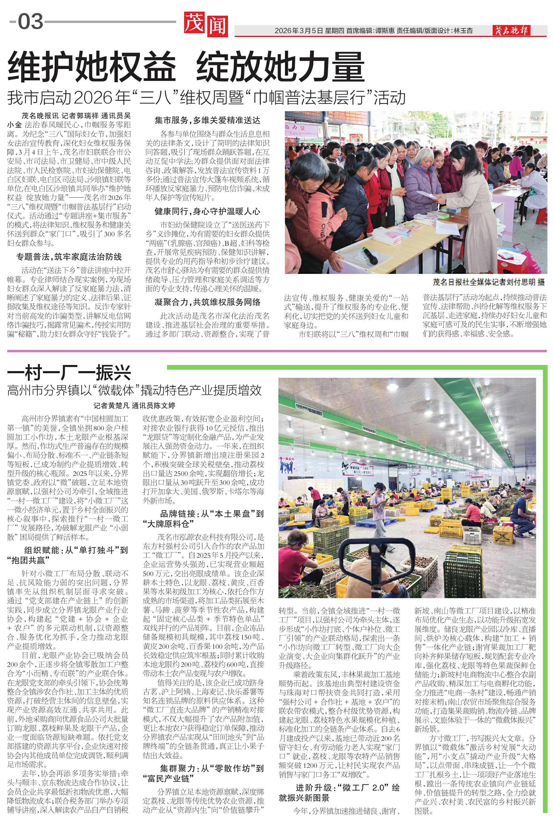 今年,分界镇加速推进储良、谢宵、新坡、南山等微工厂项目建设,以精准布局优化产业生态,以功能升级拓宽发展维度。储良龙眼产业园以冷库、直播间、烘炉为核心载体,构建“加工+ 销售”一体化产业链;谢宵果蔬加工厂靶向补齐鲜果储存短板,规划配套专业冷库,强化荔枝、龙眼等特色果蔬保鲜仓储能力;新坡村电商物流中心整合农副产品收购、精深加工与电商孵化功能,全力推进“电商一条村”建设,畅通产销对接末梢;南山农贸市场聚焦综合服务功能,打造集果蔬购销、物流冷链、品牌展示、文旅体验于一体的“微载体振兴”新场景。