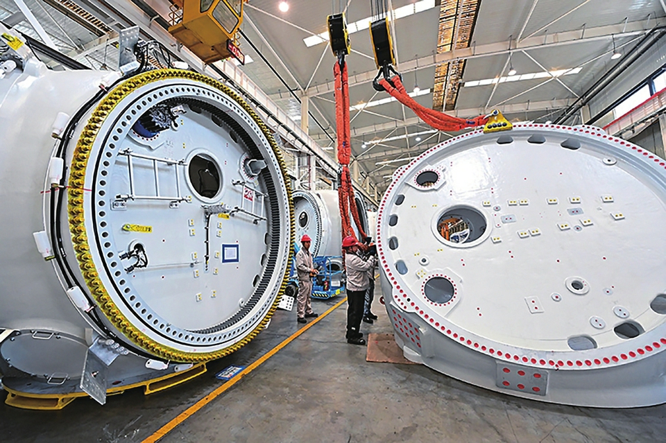 工人在位于山西转型综合改革示范区的太重集团新能源产业园区吊运风电装备。(2025年9月24日摄) 杨晨光 摄
