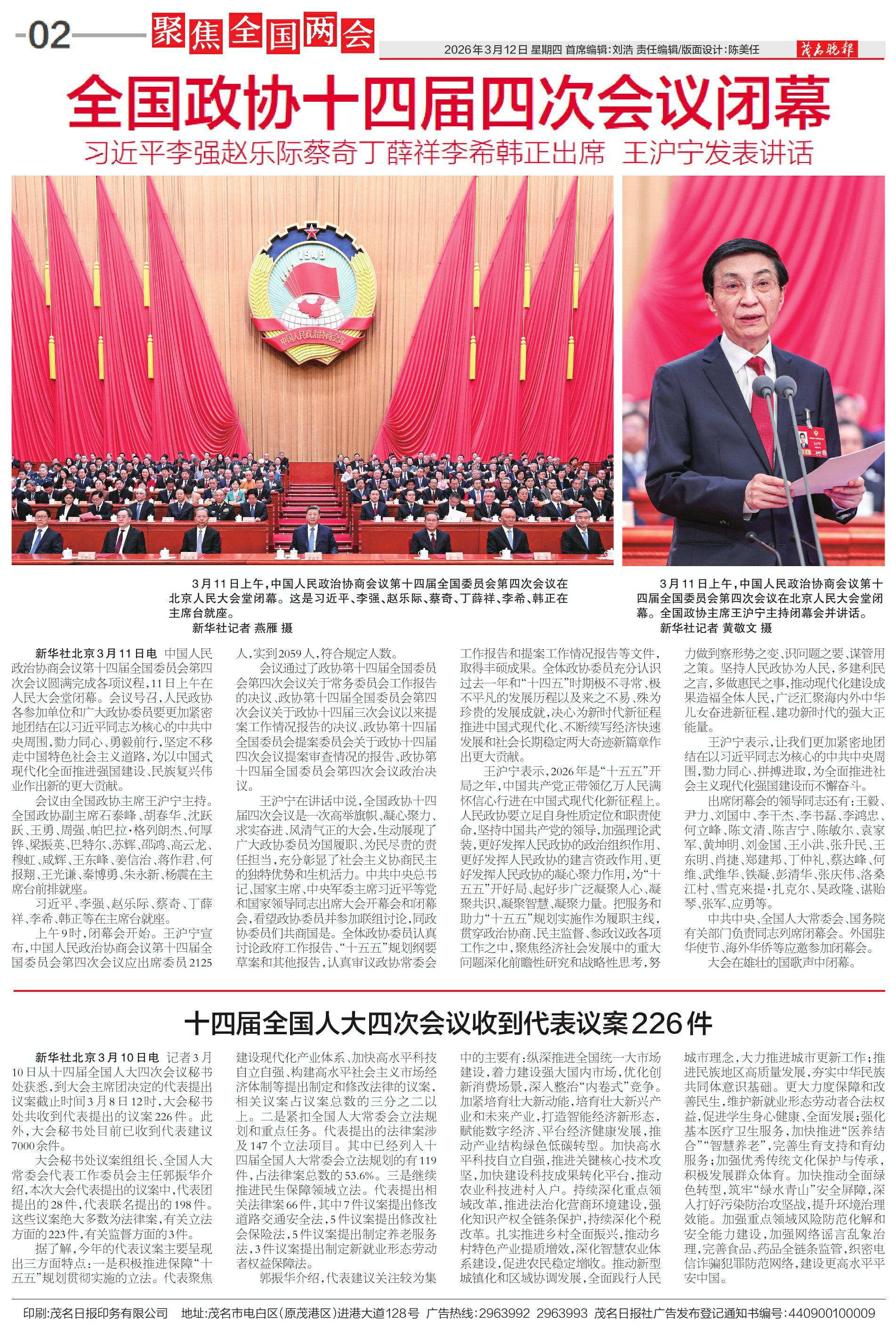3月11日上午,中国人民政治协商会议第十四届全国委员会第四次会议在北京人民大会堂闭幕。全国政协主席王沪宁主持闭幕会并讲话。 新华社记者 黄敬文 摄