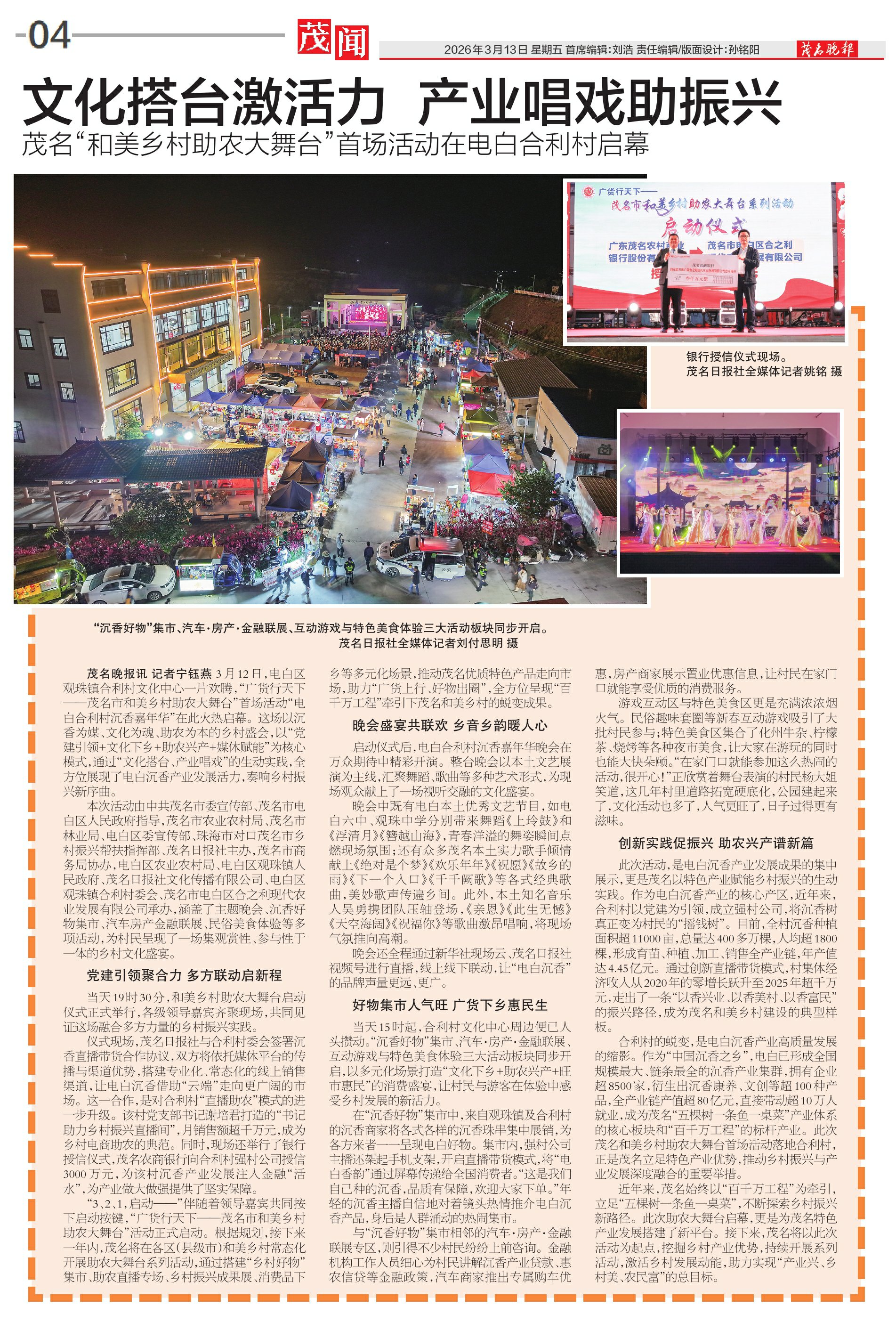 本次活动由中共茂名市委宣传部、茂名市电白区人民政府指导,茂名市农业农村局、茂名市林业局、电白区委宣传部、珠海市对口茂名市乡村振兴帮扶指挥部、茂名日报社主办,茂名市商务局协办,电白区农业农村局、电白区观珠镇人民政府、茂名日报社文化传播有限公司、电白区观珠镇合利村委会、茂名市电白区合之利现代农业发展有限公司承办,涵盖了主题晚会、沉香好物集市、汽车房产金融联展、民俗美食体验等多项活动,为村民呈现了一场集观赏性、参与性于一体的乡村文化盛宴。