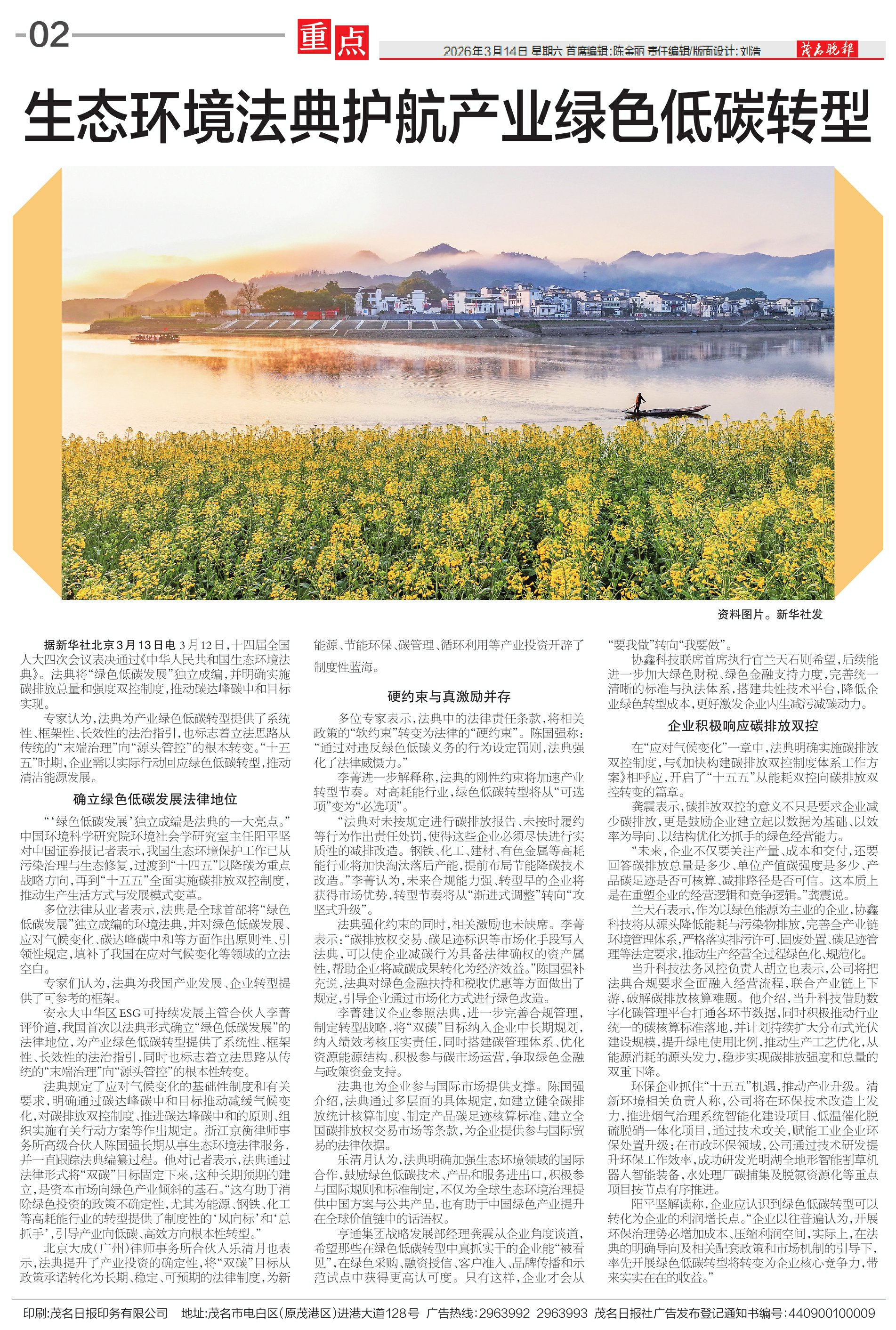 多位法律从业者表示,法典是全球首部将“绿色低碳发展”独立成编的环境法典,并对绿色低碳发展、应对气候变化、碳达峰碳中和等方面作出原则性、引领性规定,填补了我国在应对气候变化等领域的立法空白。
