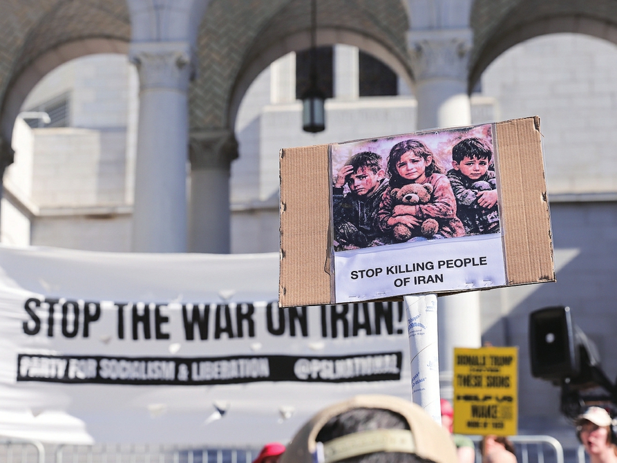 3月7日,在美国加利福尼亚州洛杉矶市政厅前,人们参加集会抗议美国和以色列对伊朗发动军事打击。新华社发(邱晨 摄)