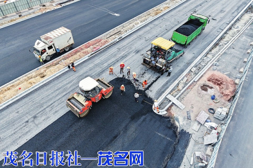 茂名大道大园路与官渡路段铺设沥青现场。茂名日报社全媒体记者 吴昊 摄