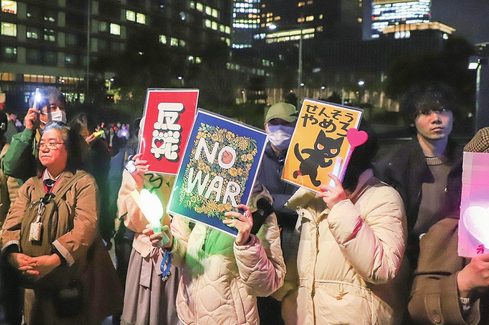 2026年3月19日,人们在日本东京国会议员会馆前参加抗议集会,对高市早苗政府近期释放修宪信号、决定部署远程导弹等危险政策动向表示抗议。新华社记者陈泽安摄