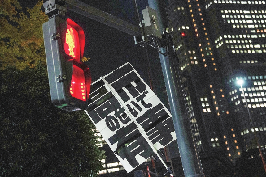 2025年11月21日,在日本东京的首相官邸外,民众举起标语参加抗议活动。新华社记者贾浩成摄