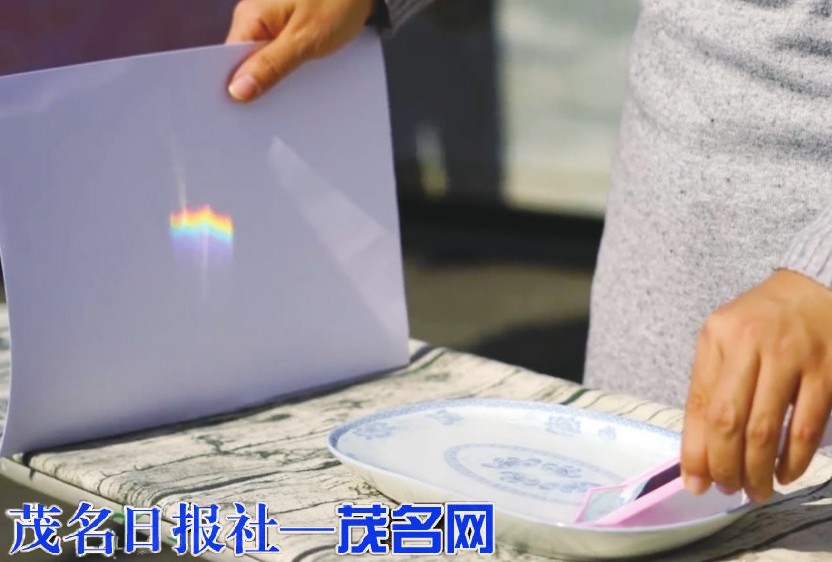 注:本实验需要在阳光下进行 现象:可以发现,白纸上呈现出彩色的条纹,就像是迷你版的彩虹。