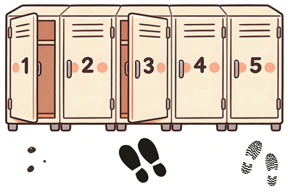 ·嫌疑人B:小脚,鞋底是圆点纹,口袋里有一块巧克力,刚从1号柜拿过作业本