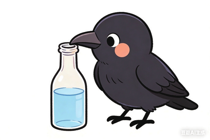 乌鸦口渴了,看到一个瓶子,里面有半瓶水。但瓶口太窄,它的嘴伸不进去。以前的故事里,乌鸦是叼石子让水位升高。但这次……旁边没有石子! 请你帮乌鸦想想办法,从上面选出能用的材料,用画线的方式连到瓶子上,并在下面写一句简短的“我的办法”。 提示:不一定要让水位升高,也可以换一种方式喝到水。提供的材料有:1. 一根吸管2. 一块海绵3. 一片大树叶4. 一只空瓶子5. 一根细树枝6. 一块大石头