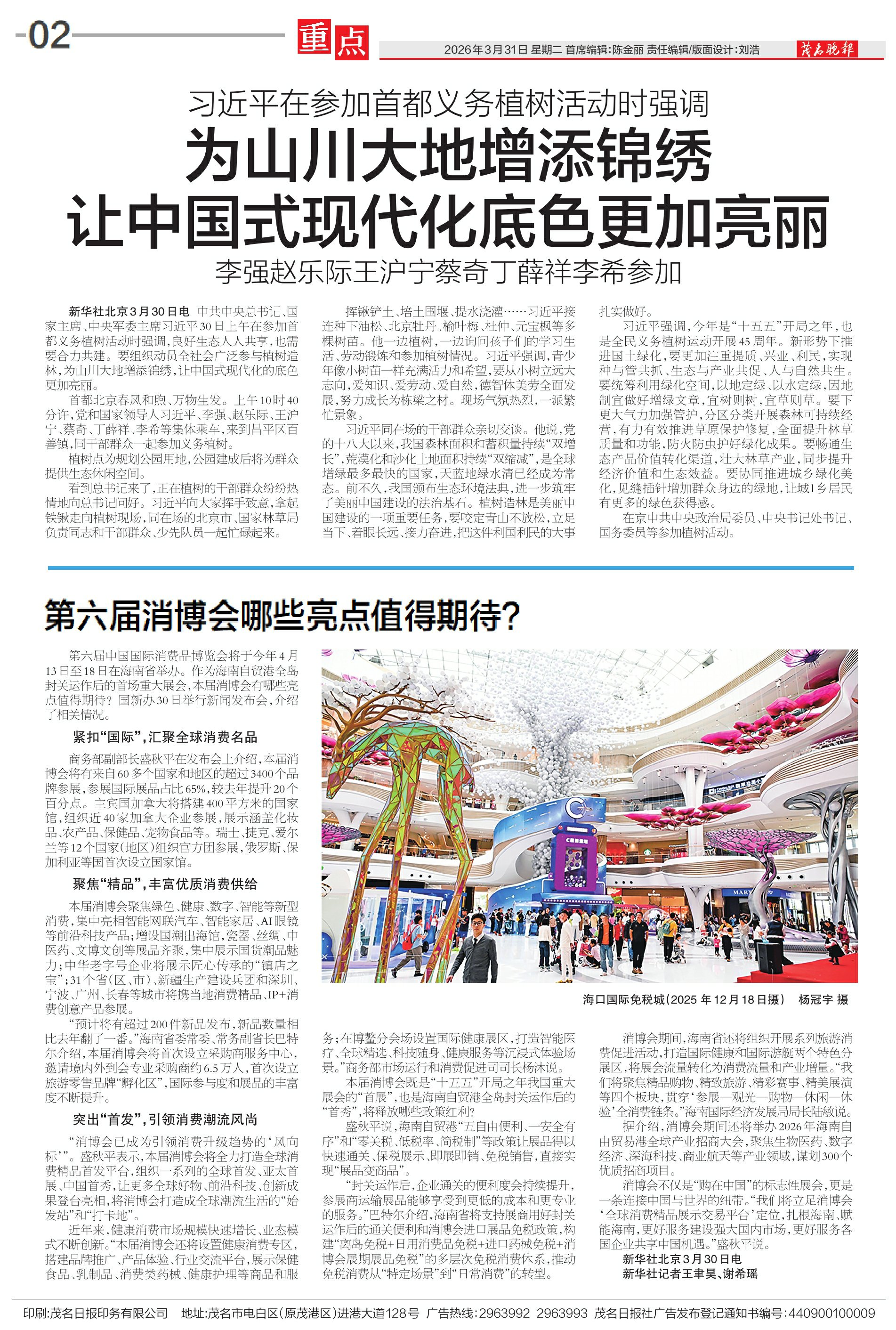 新华社北京3月30日电 中共中央总书记、国家主席、中央军委主席习近平30日上午在参加首都义务植树活动时强调,良好生态人人共享,也需要合力共建。要组织动员全社会广泛参与植树造林,为山川大地增添锦绣,让中国式现代化的底色更加亮丽。